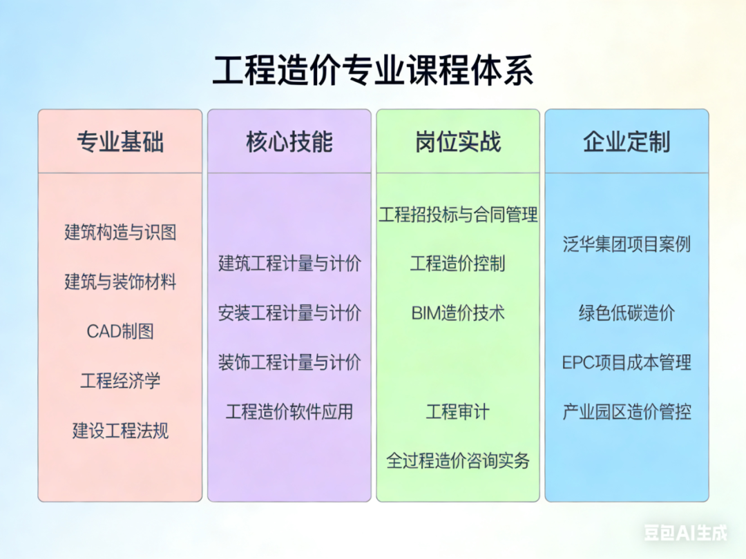 就业:合格毕业生可优先入职泛华建设集团及旗下子公司、合作单位,从事造价咨询、成本管理、招投标、项目管理等岗位;亦可进入大型建筑集团、造价事务所、监理公司、审计机构、政府投资平台,从事工程预结算、成本管控、造价审计、招标代理等工作。