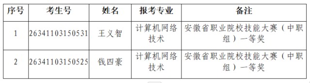 依据教育部、安徽省教育厅有关政策,按照我校2026年分类招生章程相关规定,对符合条件的技能拔尖人才考生,免于职业技能考试。经过对申请考生所提交的资料进行审核,有以下2名考生符合技能拔尖人才条件,现公示如下:对公示名单如有异议,请通过邮件向我校招生办公室反映;联系电话:0551-62231188