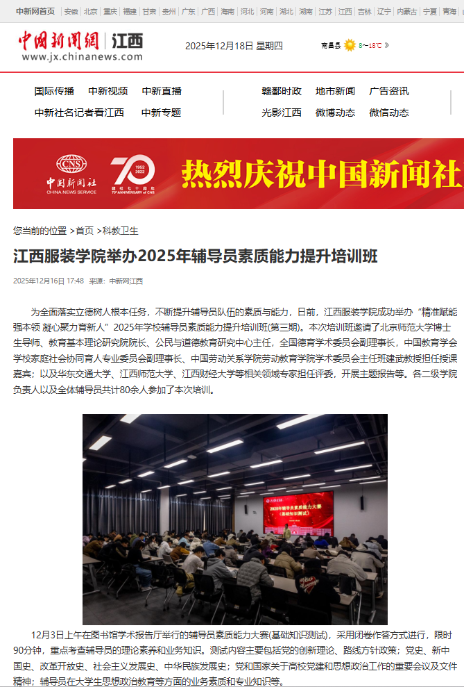 为全面落实立德树人根本任务,不断提升辅导员队伍的素质与能力,日前,江西服装学院成功举办“精准赋能强本领 凝心聚力育新人”2025年学校辅导员素质能力提升培训班(第三期)。本次培训班邀请了北京师范大学博士生导师、教育基本理论研究院院长、公民与道德教育研究中心主任,全国德育学术委员会副理事长,中国教育学会学校家庭社会协同育人专业委员会副理事长、中国劳动关系学院劳动教育学院学术委员会主任班建武教授担任授课嘉宾;以及华东交通大学、江西师范大学、江西财经大学等相关领域专家担任评委,开展主题报告等。各二级学院负责人以及全体辅导员共计80余人参加了本次培训。