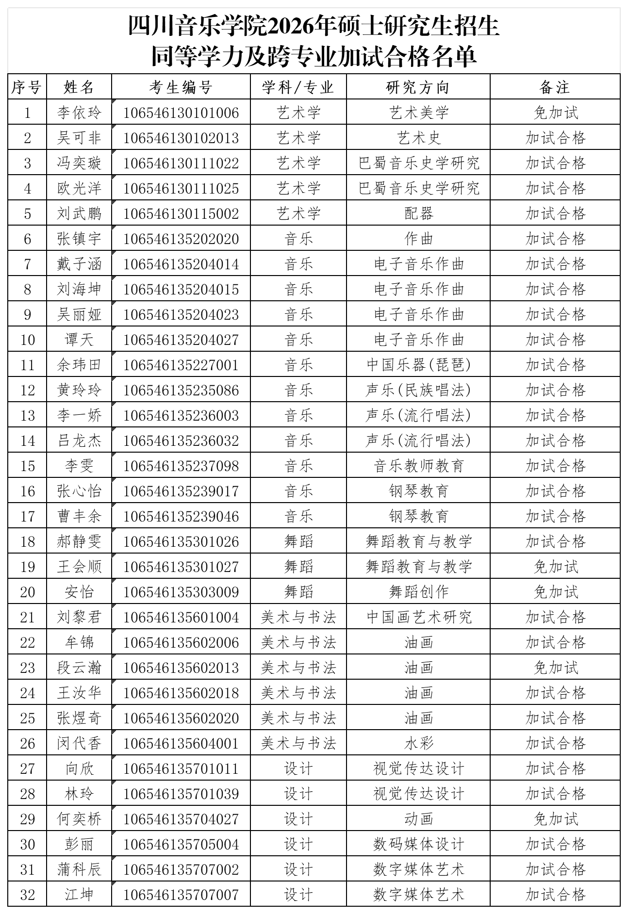 四川音乐学院2026年硕士研究生招生同等学力及跨专业加试合格名单