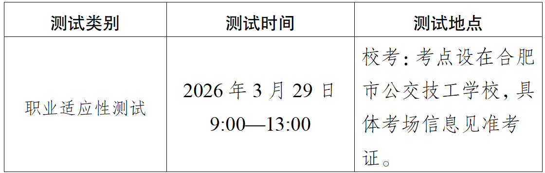 职业适应性测试采取线下面试的方式进行,命题、施考、评卷(评分)各环节在安徽省教育厅、安徽省教育考试院和兵团教育局的指导、监督下开展。测试内容依据专业培养要求,重点考查考生的专业素养、科学素质、职业潜能和职业倾向,总分为300分。