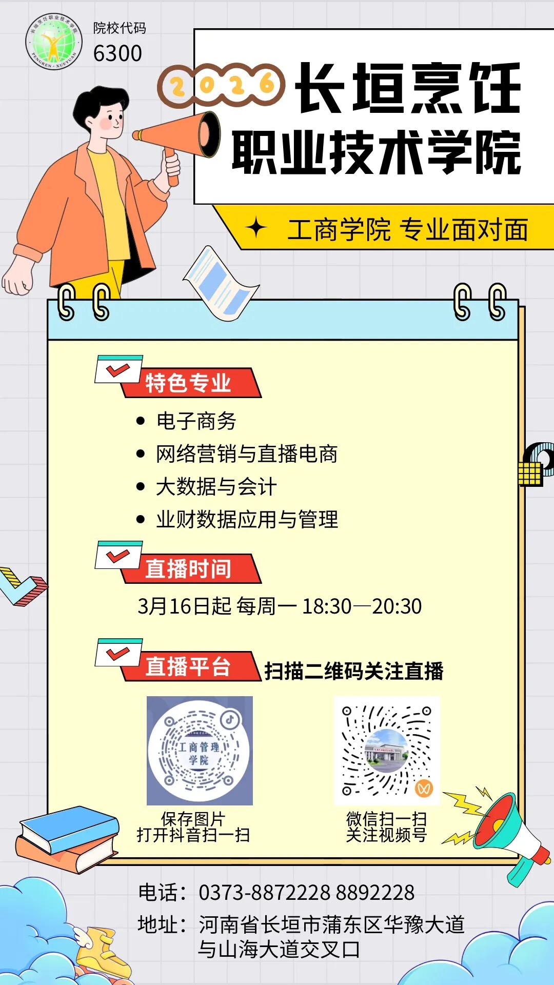 请致电0373—8872228/8892228咨询报名,也可扫描识别下方二维码,进入“长垣烹饪职业技术学院2026年高职专业网上咨询系统”进行线上咨询报名。同时,请关注招生办公室抖音号,实时了解我校最新动态!