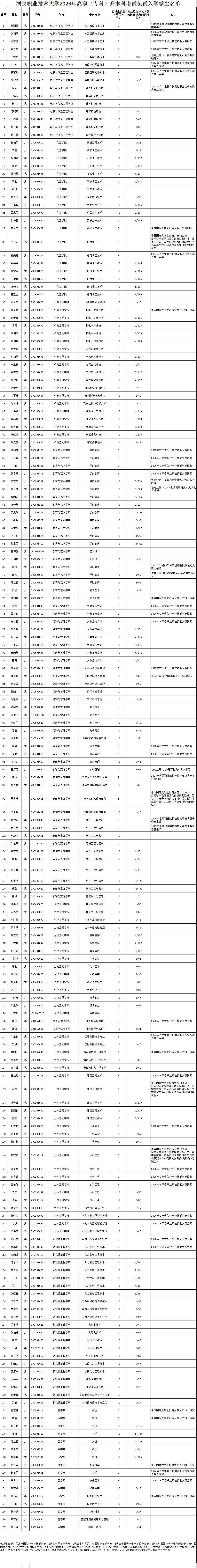 根据《酒泉职业技术大学2026年高职(专科)升本科考试免试入学资格审核实施方案》要求,经各学院初审、教务处复审,现将符合2026年高职(专科)升本科考试免试入学资格的楚明昊等187名学生予以公示,公示期3天(2026年2月13日至2月14日;2月24日)。