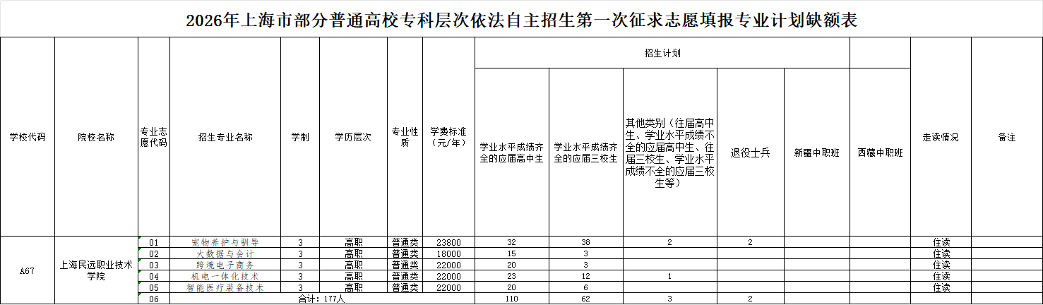 上海民远职业技术学院2026年自主招生阶段第一次征求志愿缺额计划表