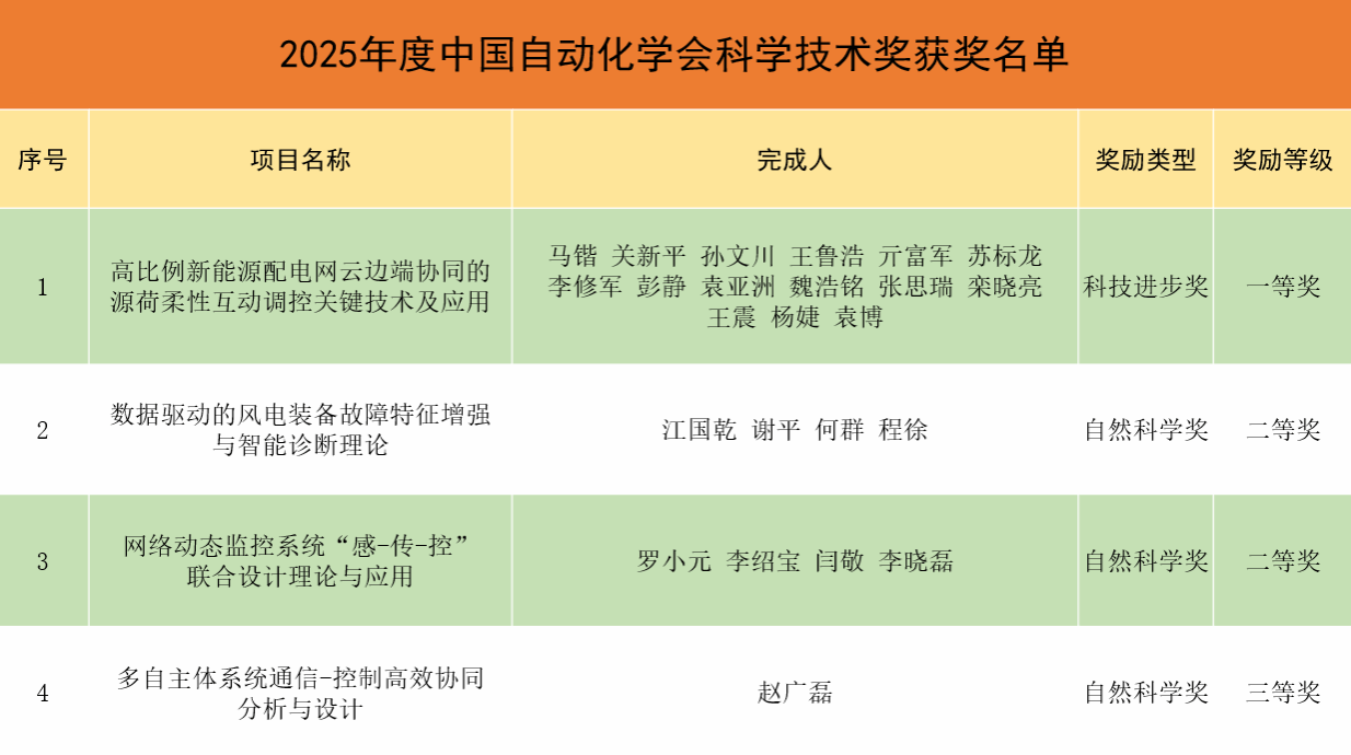 中国自动化学会(CAA)是我国自动化及相关技术领域的权威学术团体,也是国内最早的国家一级学术组织之一。中国自动化学会科学技术奖是自动化领域有重大影响力的科技奖项,也是可推荐申报国家科学技术奖的重要渠道。2025年度中国自动化学会科学技术奖共评出技术发明奖10项、自然科学奖50项、科技进步奖62项、青年科技奖22人。(编辑 王艳)