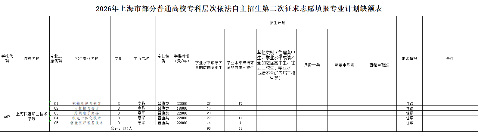 上海民远职业技术学院专科层次依法自主招生第二次征求志愿填报专业计划缺额表