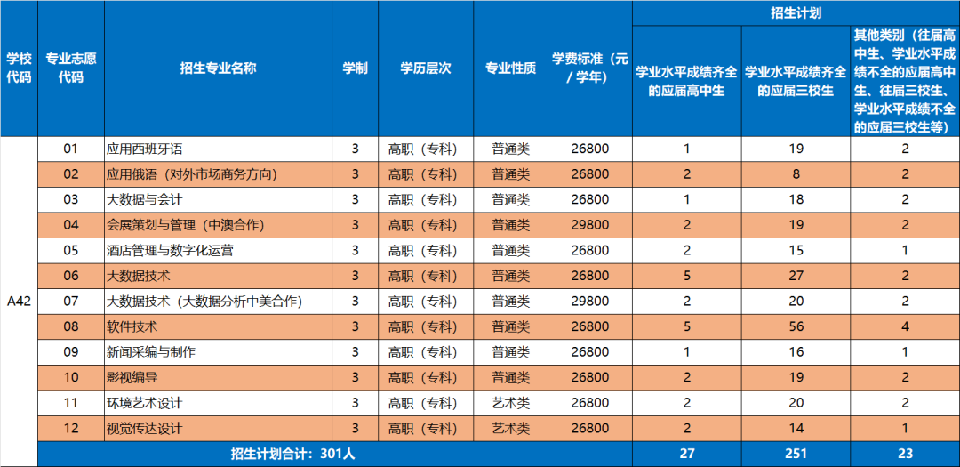 2026年上海工商外国语职业学院自主招生批次第二次征求志愿开启,本次预计征求志愿301名,其中成绩齐全的高中生征求计划为27人,成绩齐全的三校生251 人,其他类别学生23人,招生专业含普通类和艺术类共计12个。