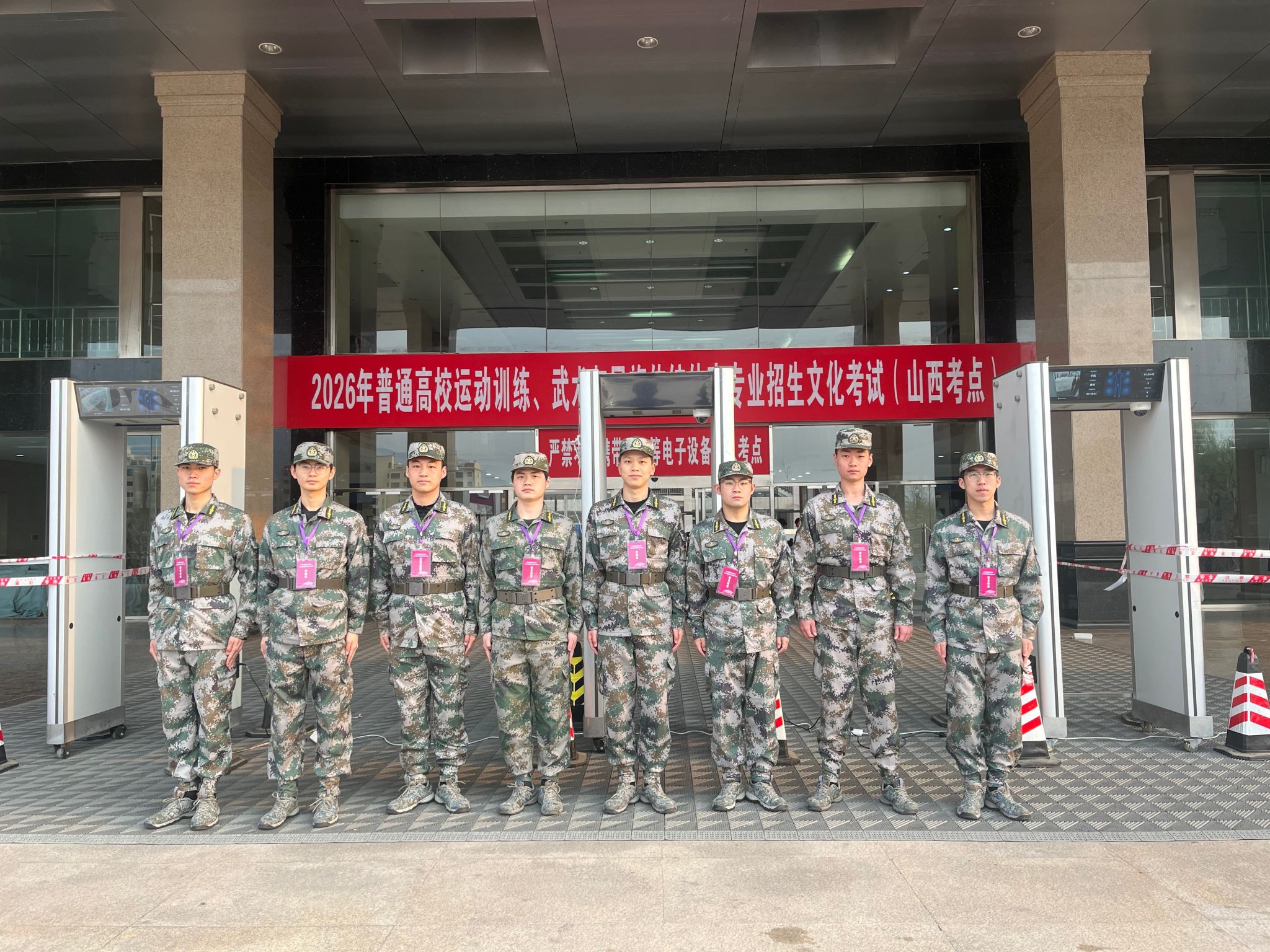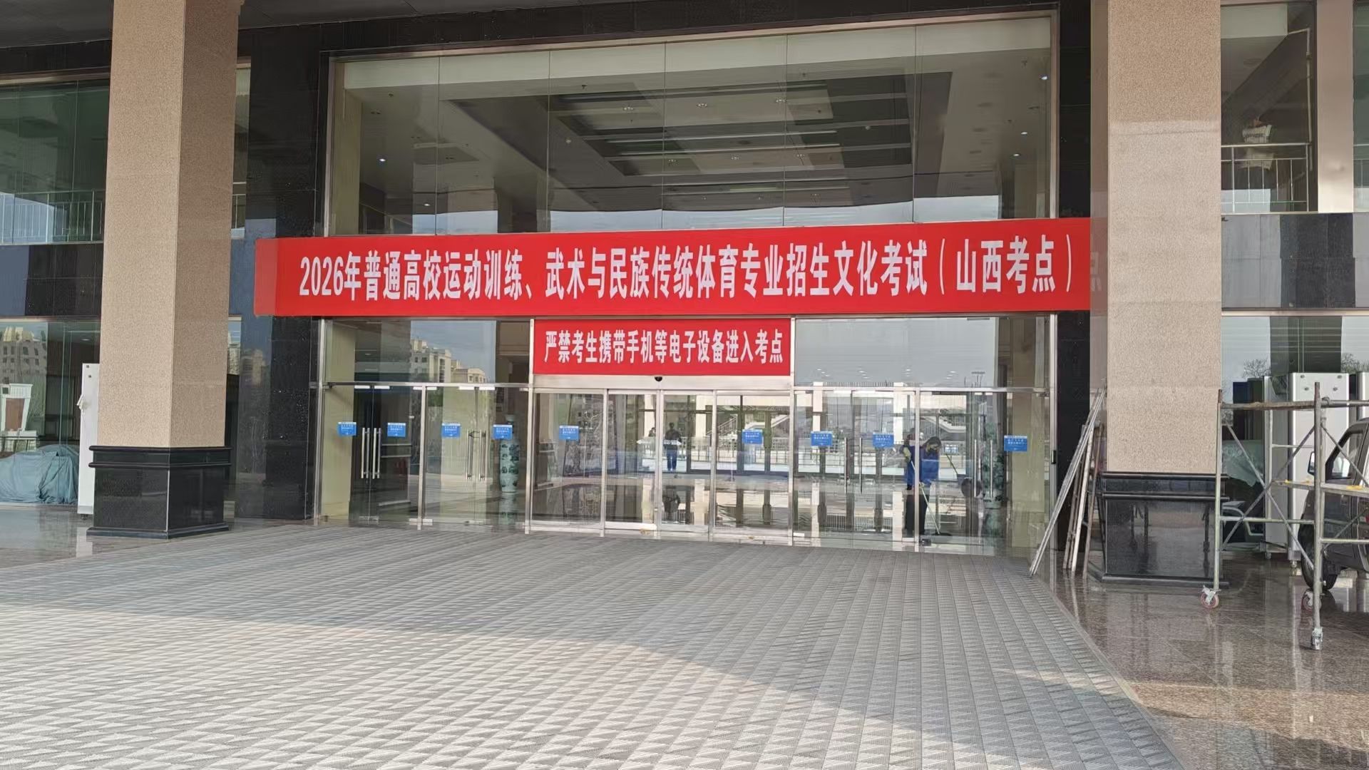 考试前一天,学校在11号教学楼二层平台设置“考场安排”“考场规则”“考场位置示意图”和“考试科目与时间”告知内容的展架和条幅,在主楼醒目位置设置举报箱,并设置手机等电子产品临时存放箱。考试当天,在考点入口处设置安检门及三位一体身份识别设备,所有考生经专用通道进入考场,杜绝手机等通信设备带入考场和替考现象的发生。考试过程得到尖草坪区教育部门和第三方公司的大力支持,设备维护人员全程参与考试前的入场检查,确保了安检门和三位一体身份识别设备的正常使用,整个考试过程没有发现考生手机带入考场现象。