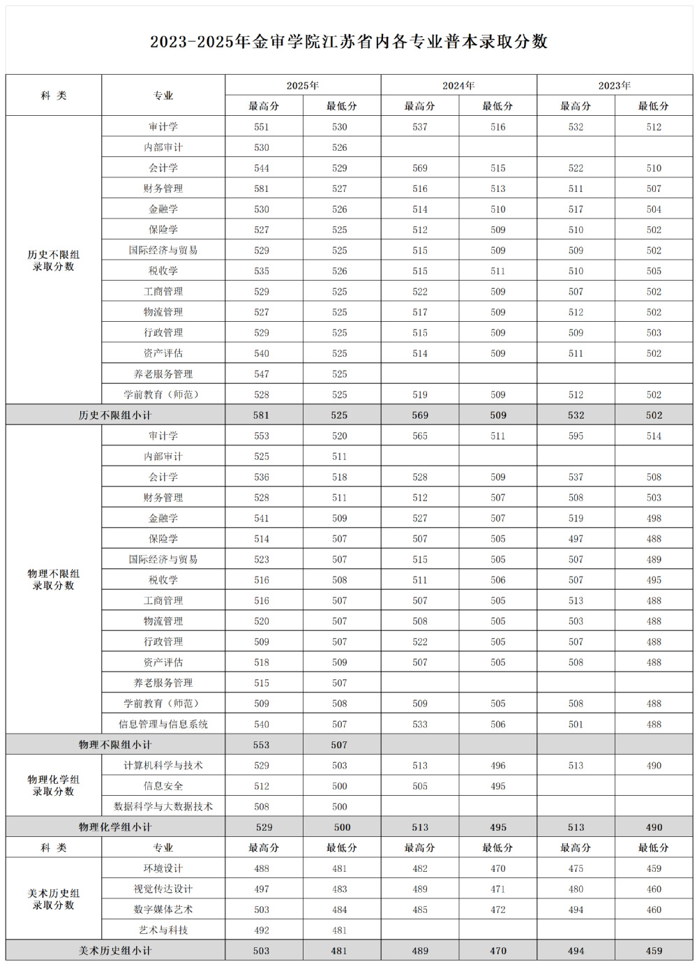 2023-2025年金审学院江苏省内各专业普本录取分数