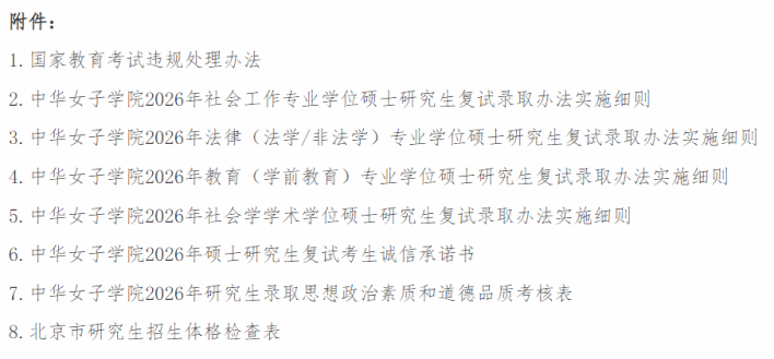 考生参加复试前务必提前学习《国家教育考试违规处理办法》(附件1)、《中华女子学院2026年社会工作专业学位硕士研究生复试录取办法实施细则》(附件2)、《中华女子学院2026年法律(法学/非法学)专业学位硕士研究生复试录取办法实施细则》(附件3)、《中华女子学院2026年教育(学前教育)专业学位硕士研究生复试录取办法实施细则》(附件4)、《中华女子学院2026年社会学学术学位硕士研究生复试录取办法实施细则》(附件5),保证充分了解复试纪律和要求、各专业复试流程和实施办法。