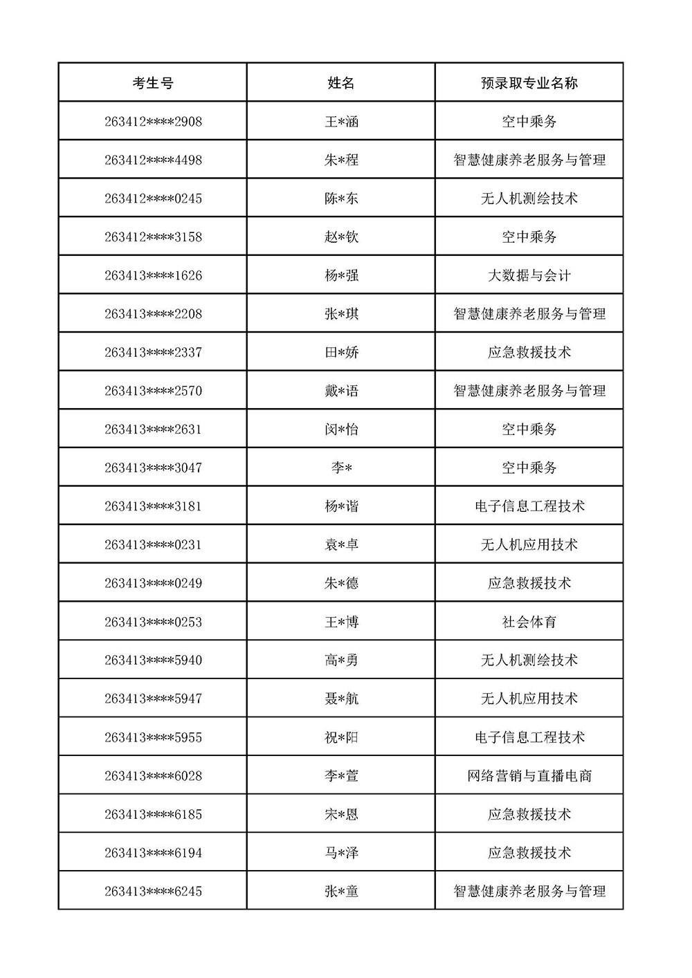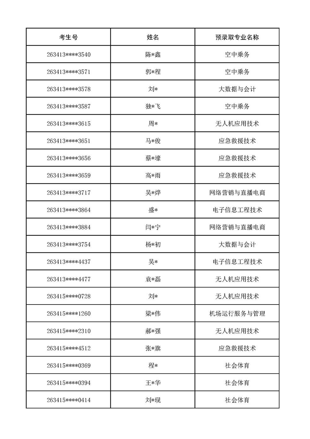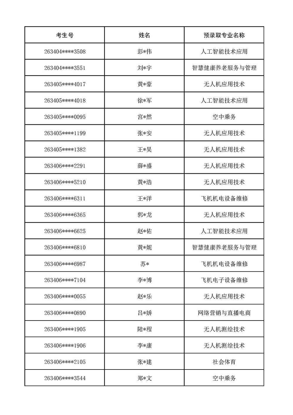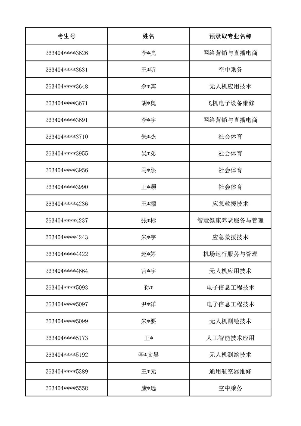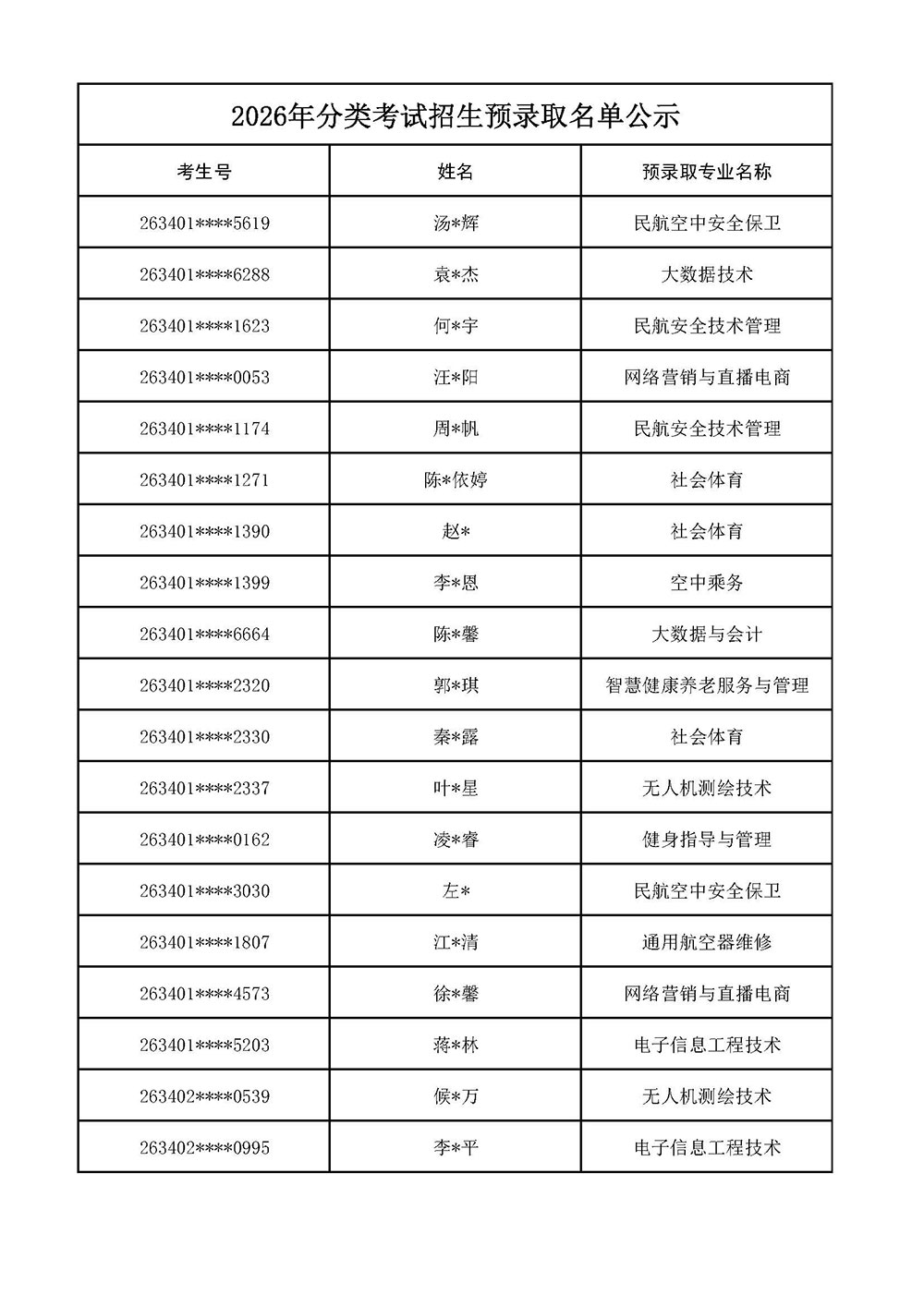 根据《宿州航空职业学院2026年高职院校分类考试招生章程》有关规定,现将预录取名单公示如下,如有异议,请拨打电话0557-2352888,公示时间:2026年4月4日—4月6日。