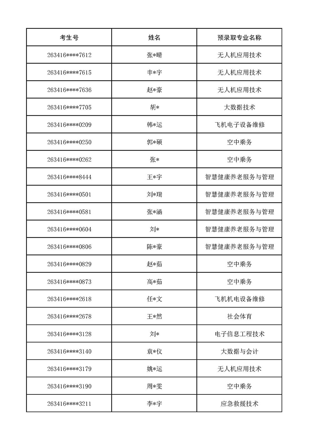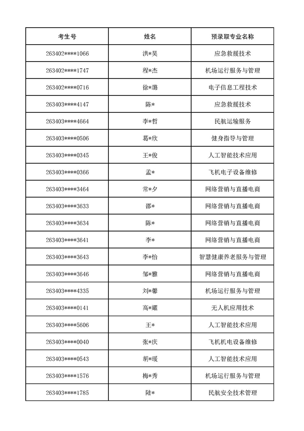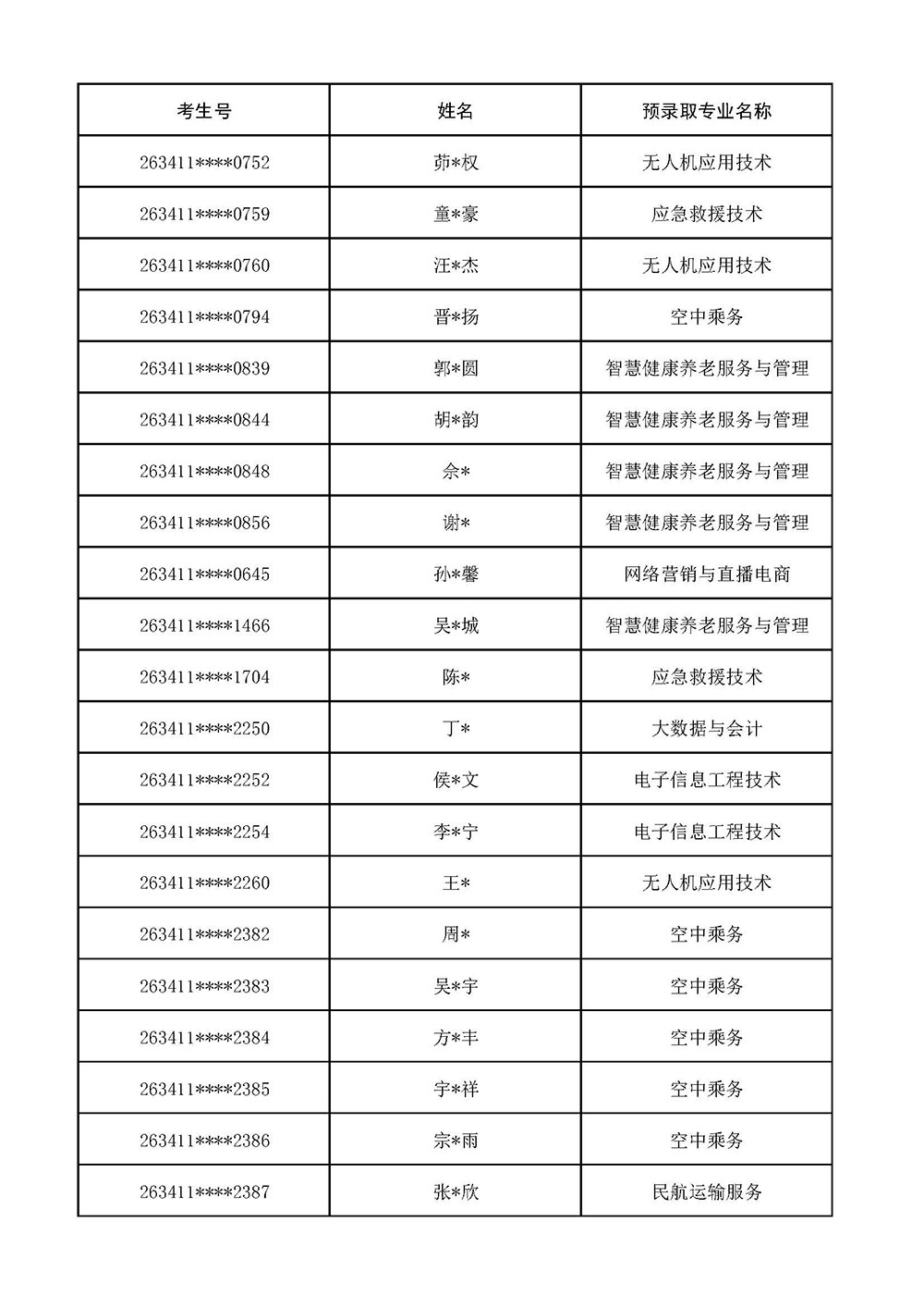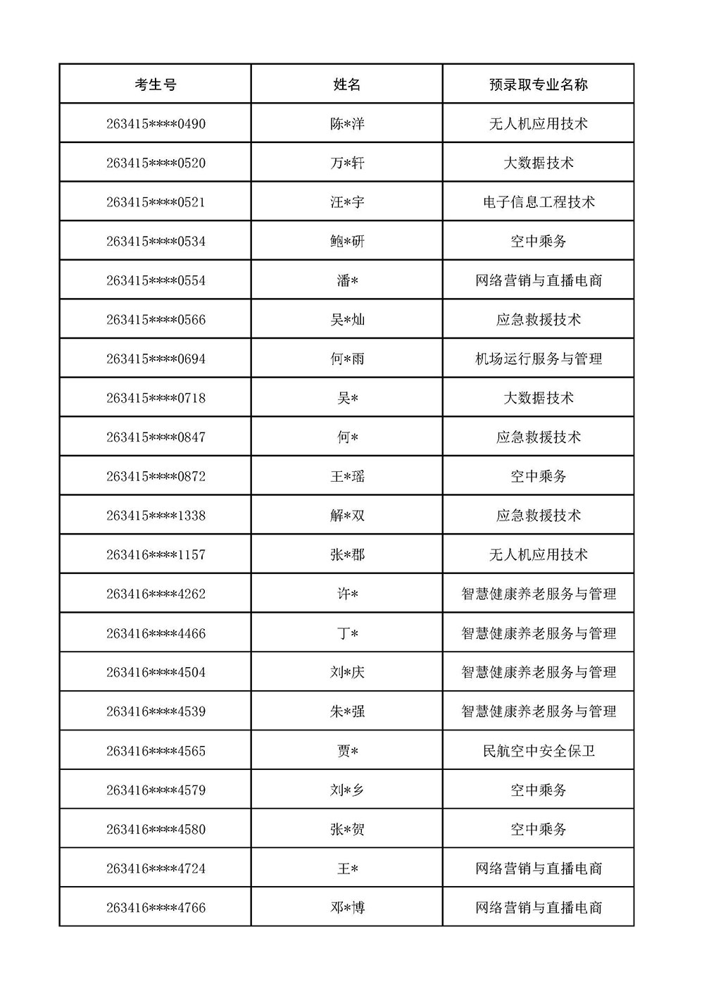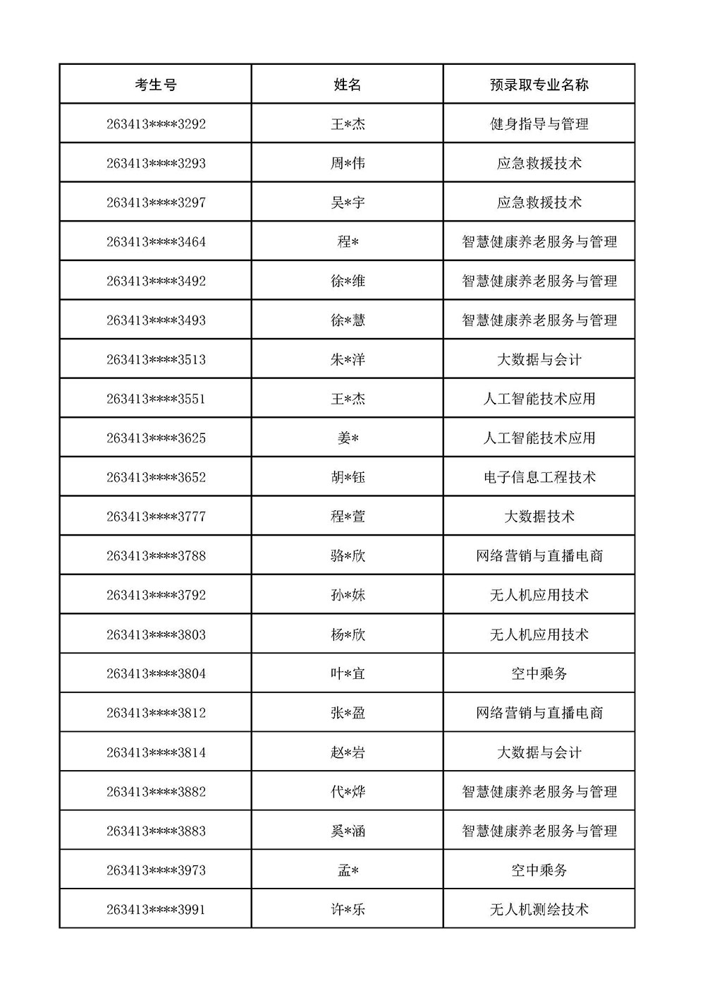 根据《宿州航空职业学院2026年高职院校分类考试招生章程》有关规定,现将预录取名单公示如下,如有异议,请拨打电话0557-2352888,公示时间:2026年4月4日—4月6日。