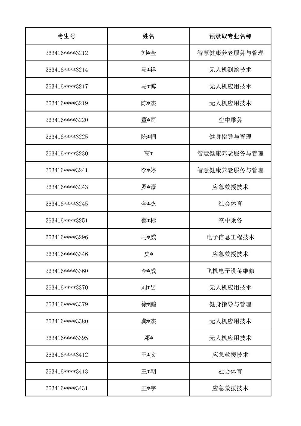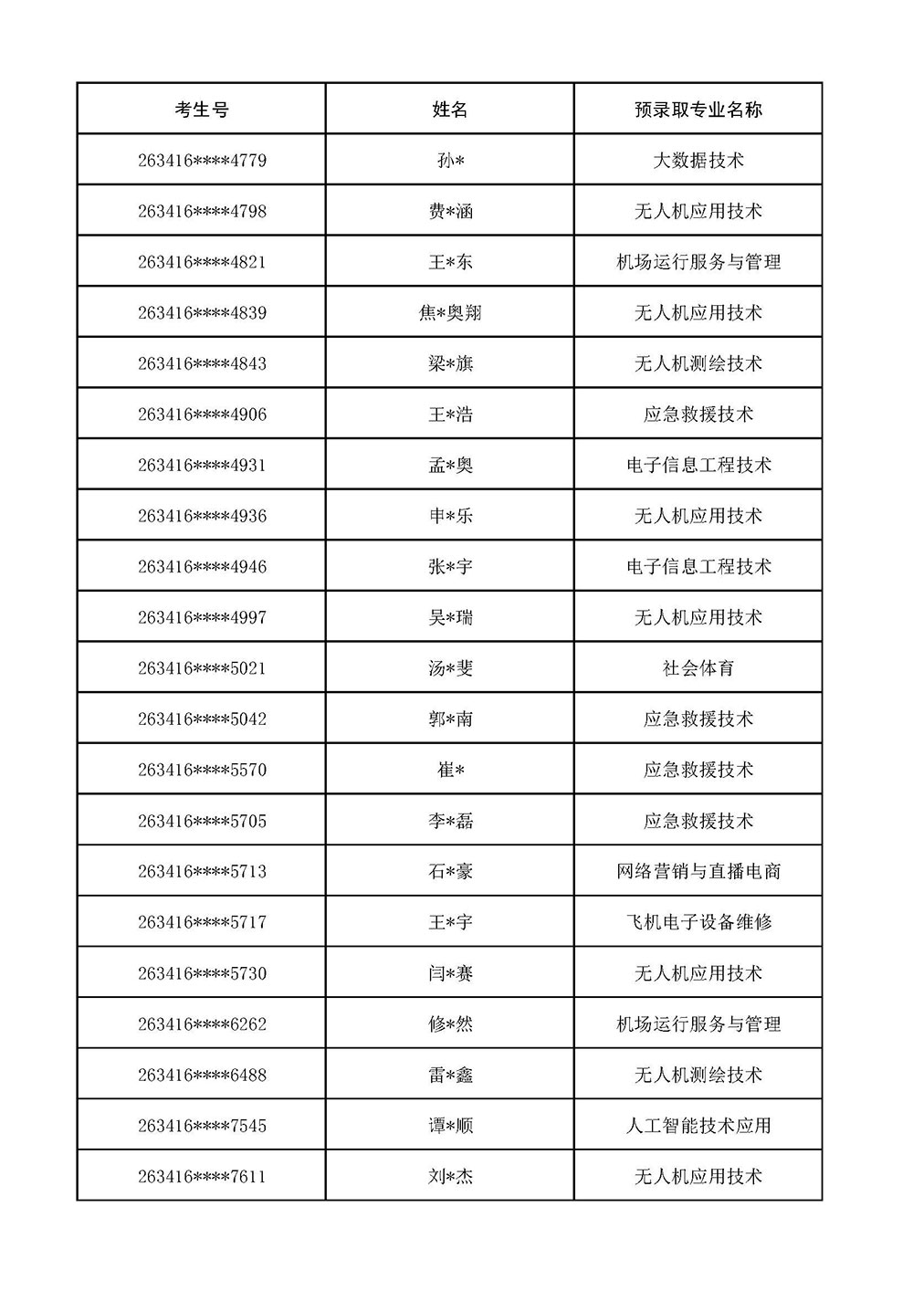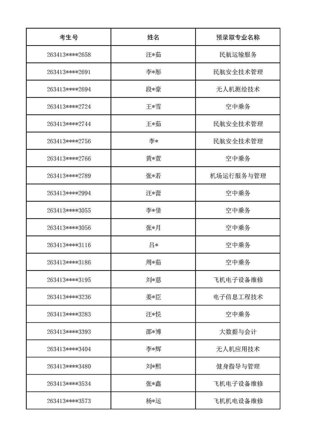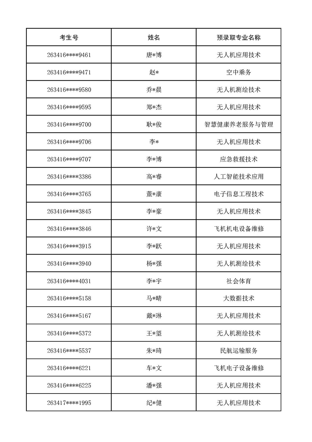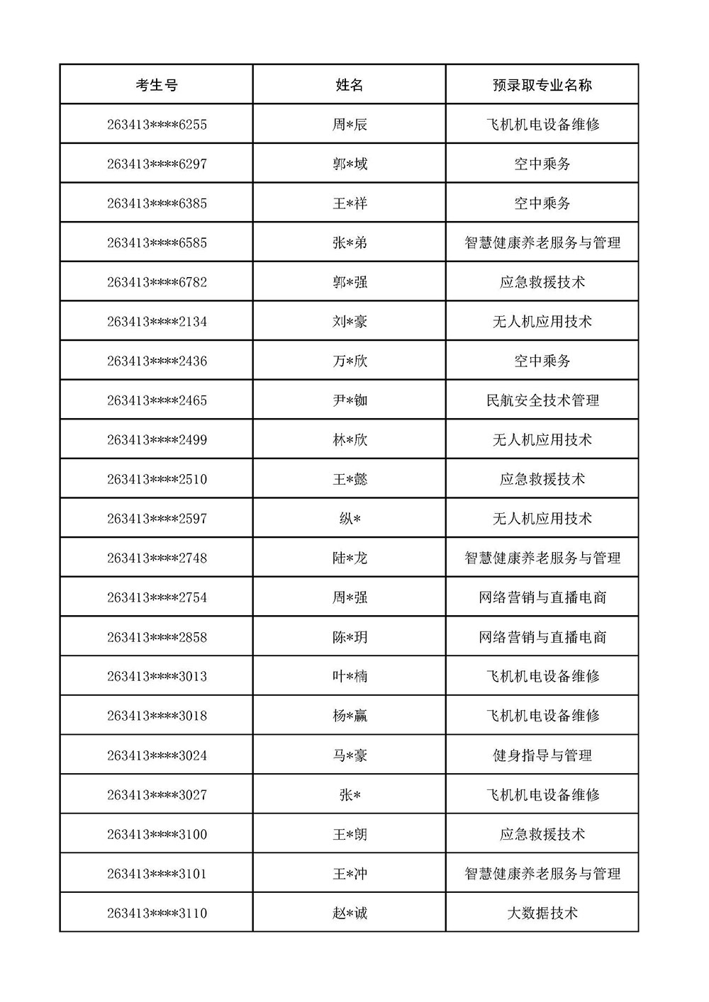根据《宿州航空职业学院2026年高职院校分类考试招生章程》有关规定,现将预录取名单公示如下,如有异议,请拨打电话0557-2352888,公示时间:2026年4月4日—4月6日。