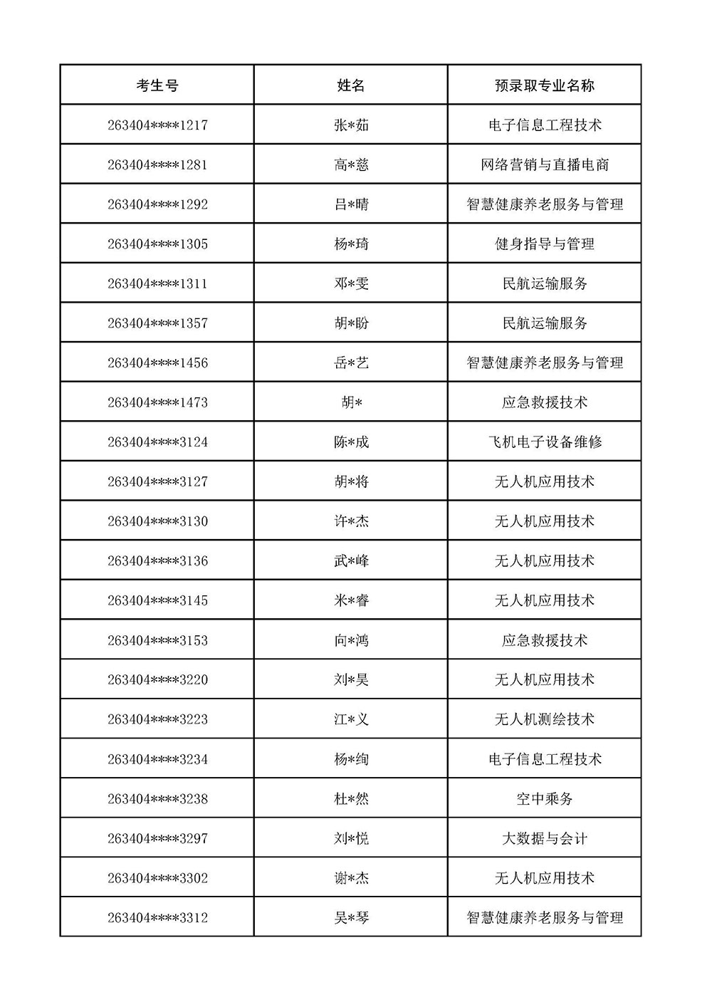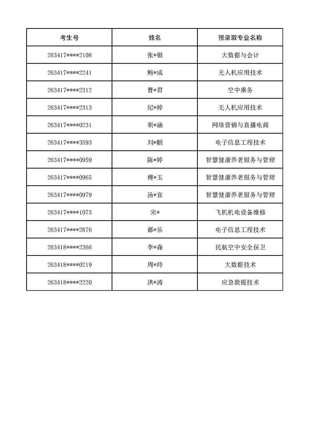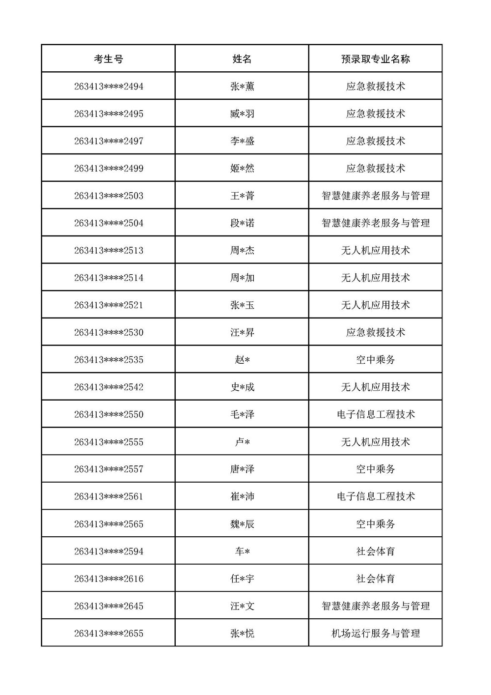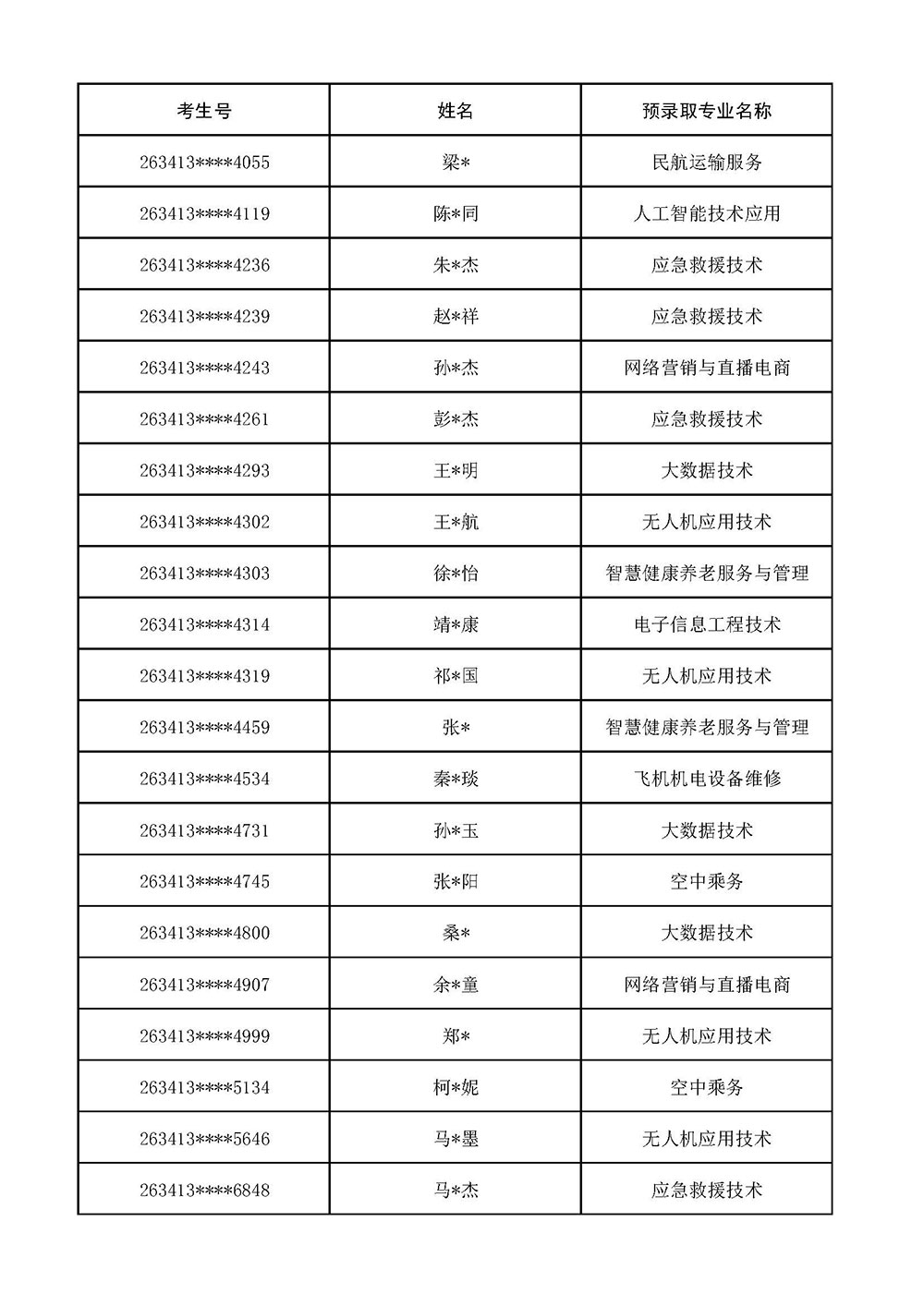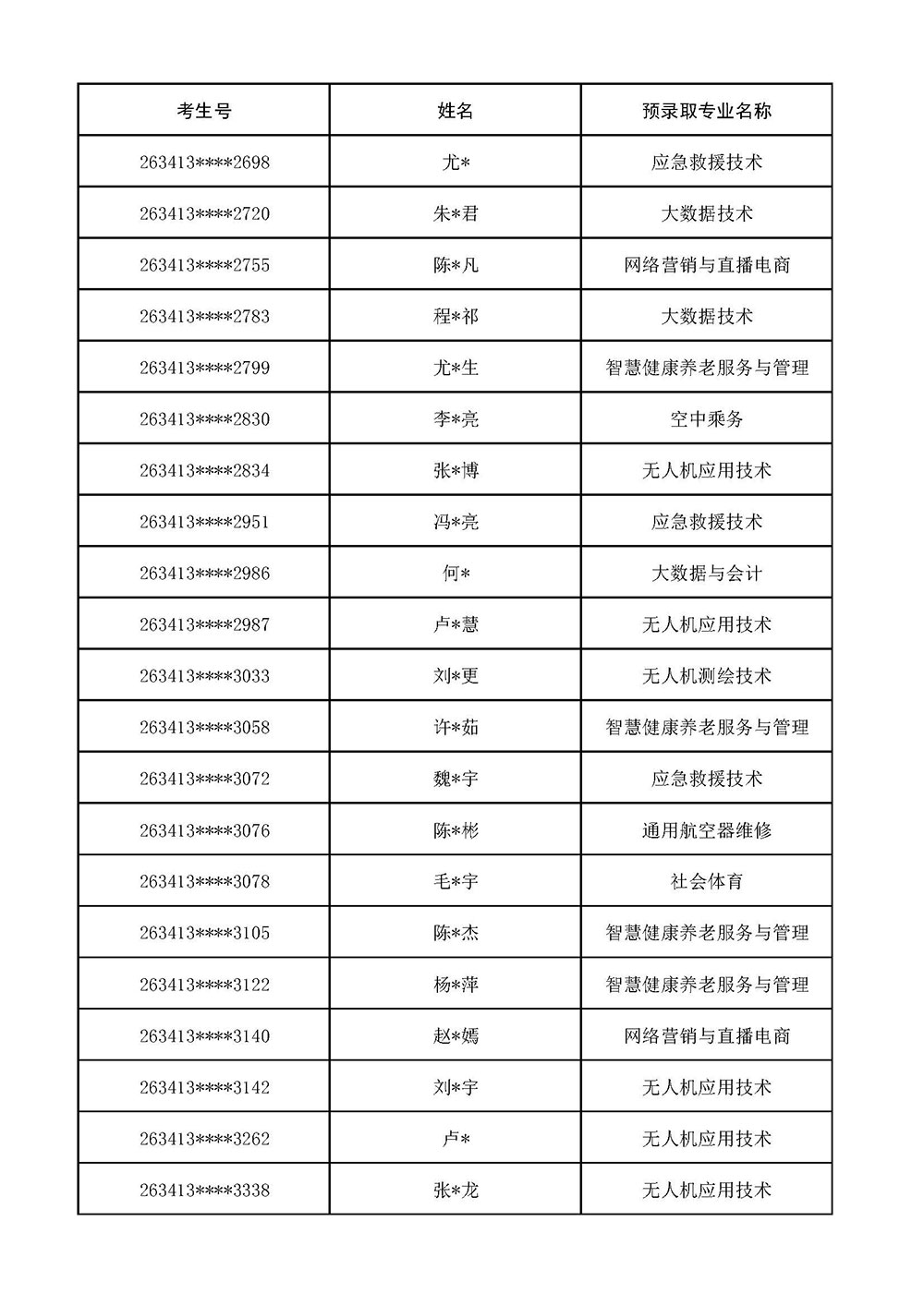 根据《宿州航空职业学院2026年高职院校分类考试招生章程》有关规定,现将预录取名单公示如下,如有异议,请拨打电话0557-2352888,公示时间:2026年4月4日—4月6日。