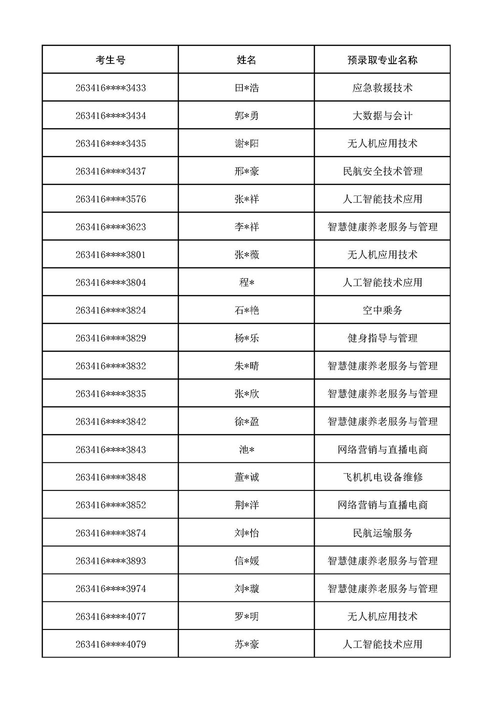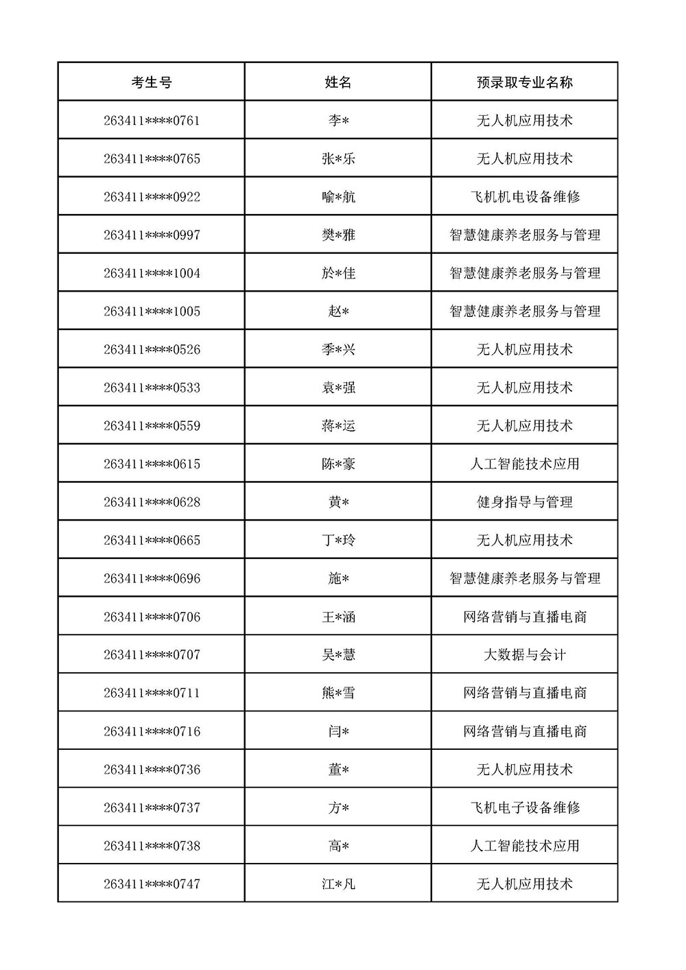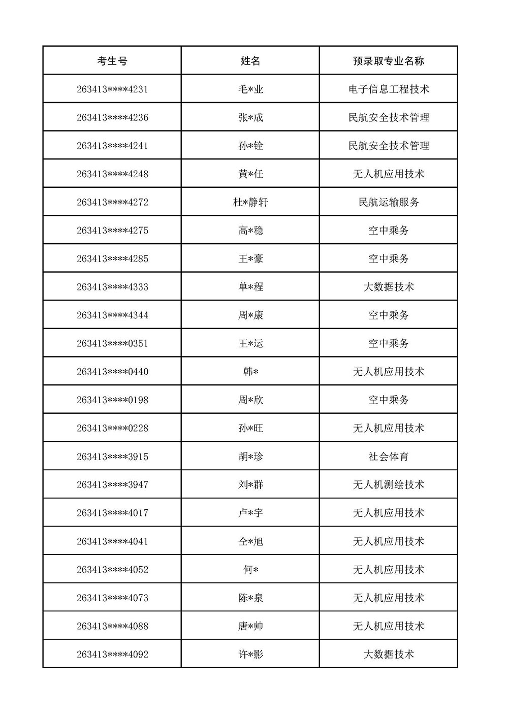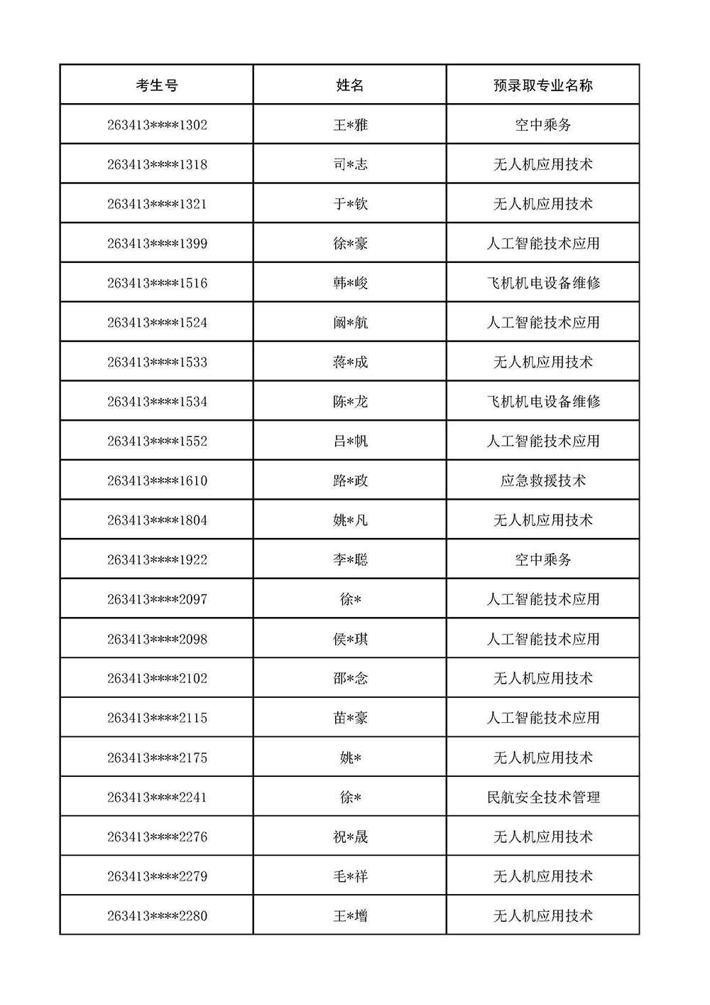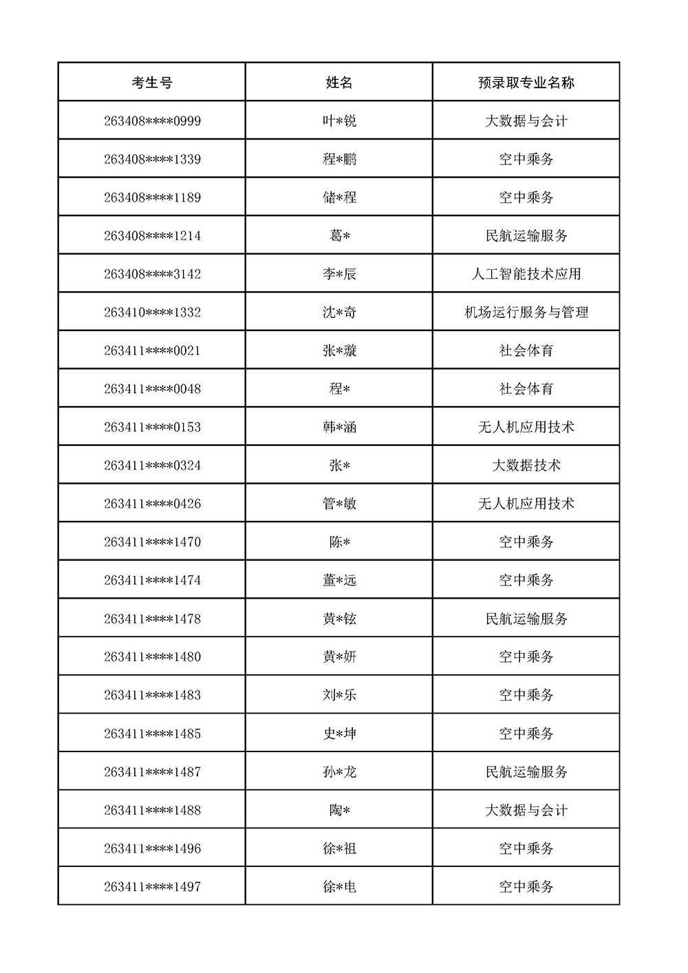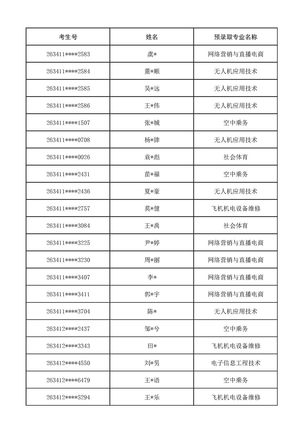 根据《宿州航空职业学院2026年高职院校分类考试招生章程》有关规定,现将预录取名单公示如下,如有异议,请拨打电话0557-2352888,公示时间:2026年4月4日—4月6日。