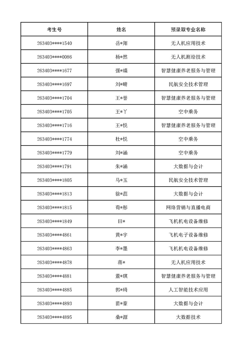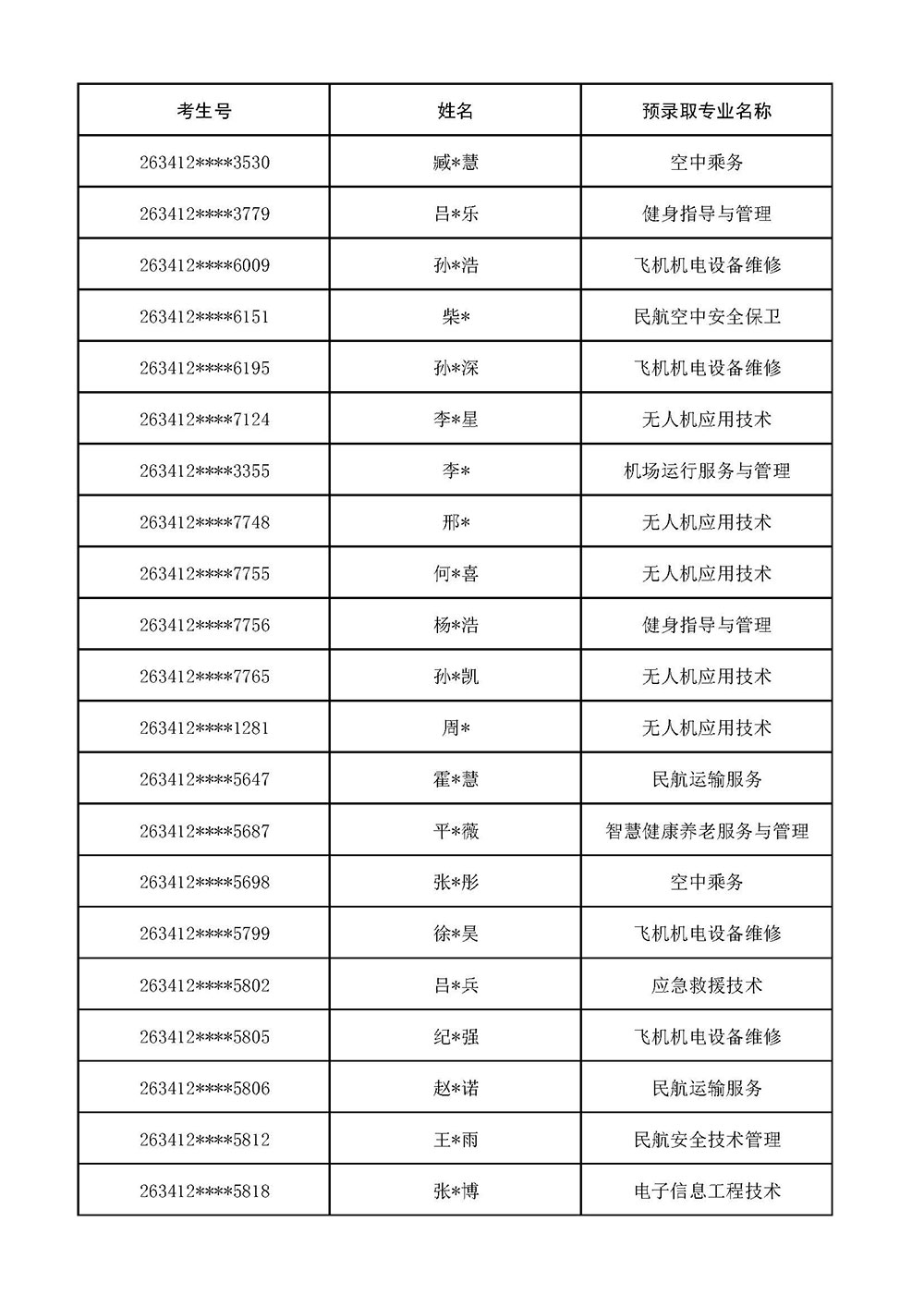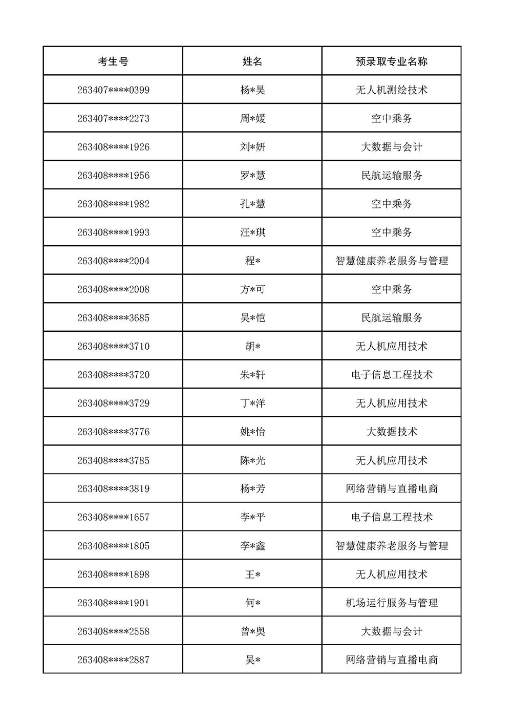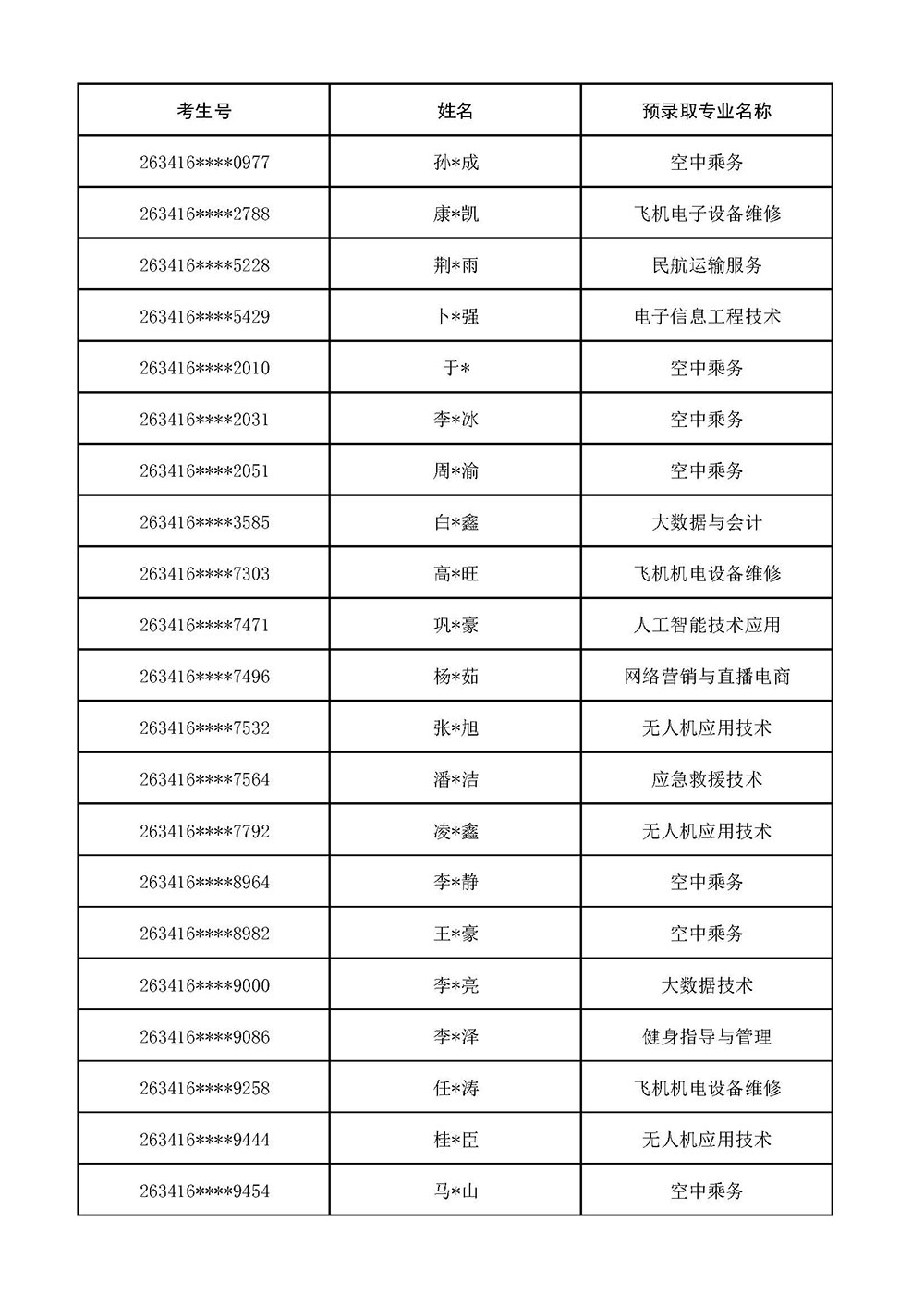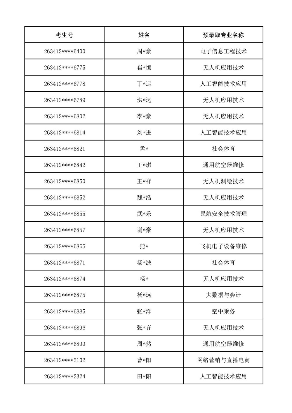 根据《宿州航空职业学院2026年高职院校分类考试招生章程》有关规定,现将预录取名单公示如下,如有异议,请拨打电话0557-2352888,公示时间:2026年4月4日—4月6日。