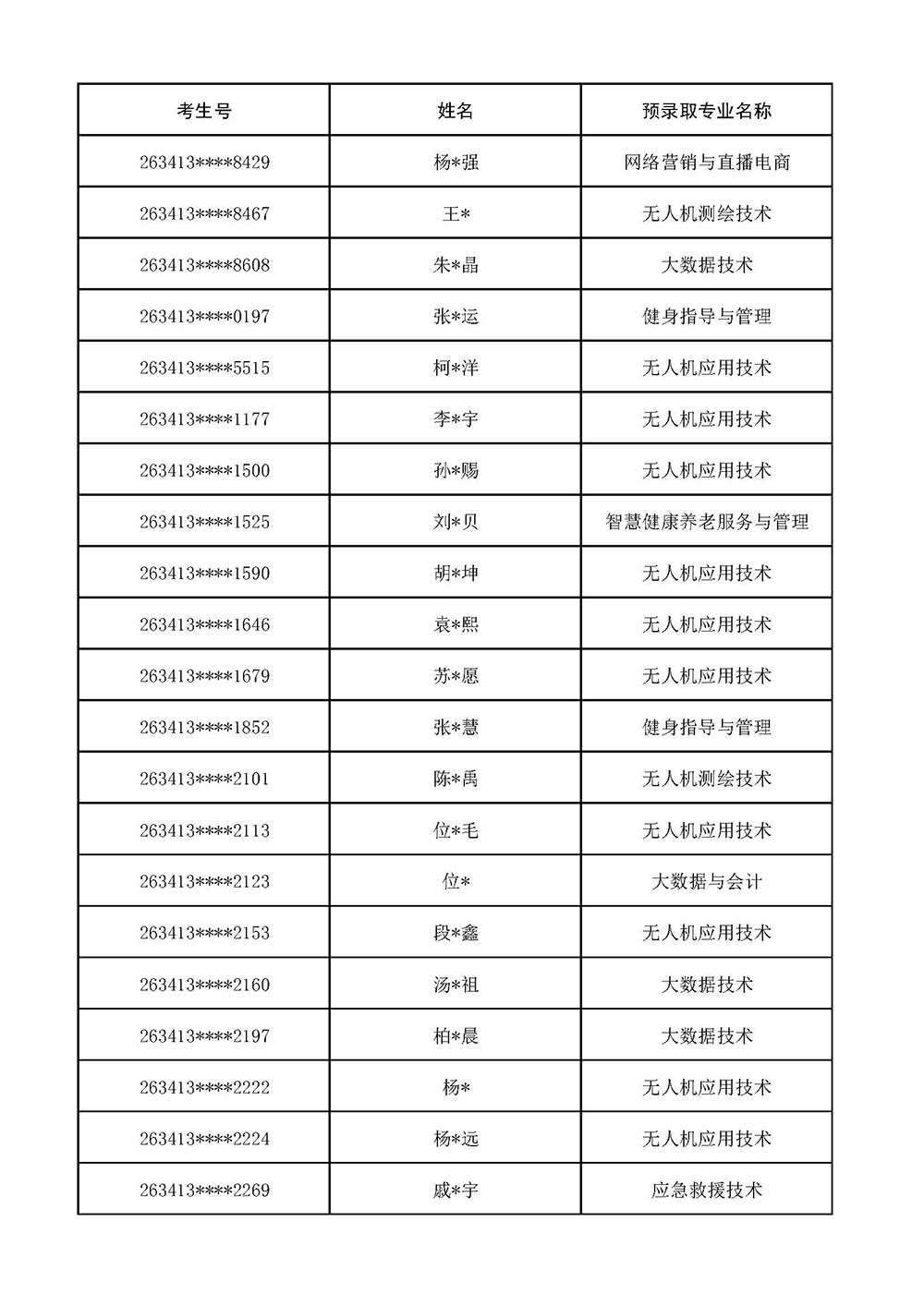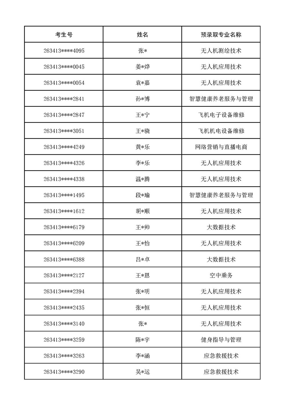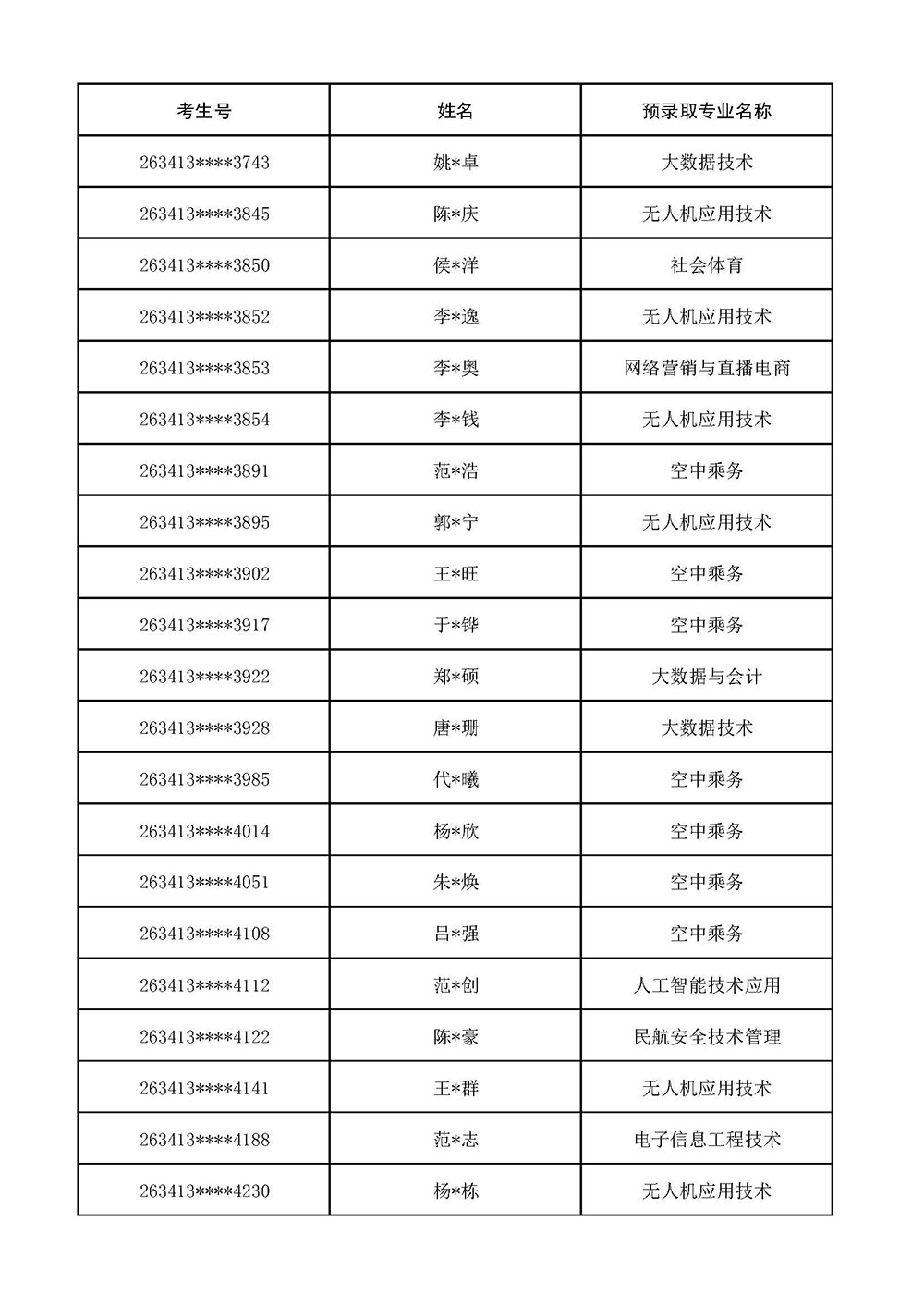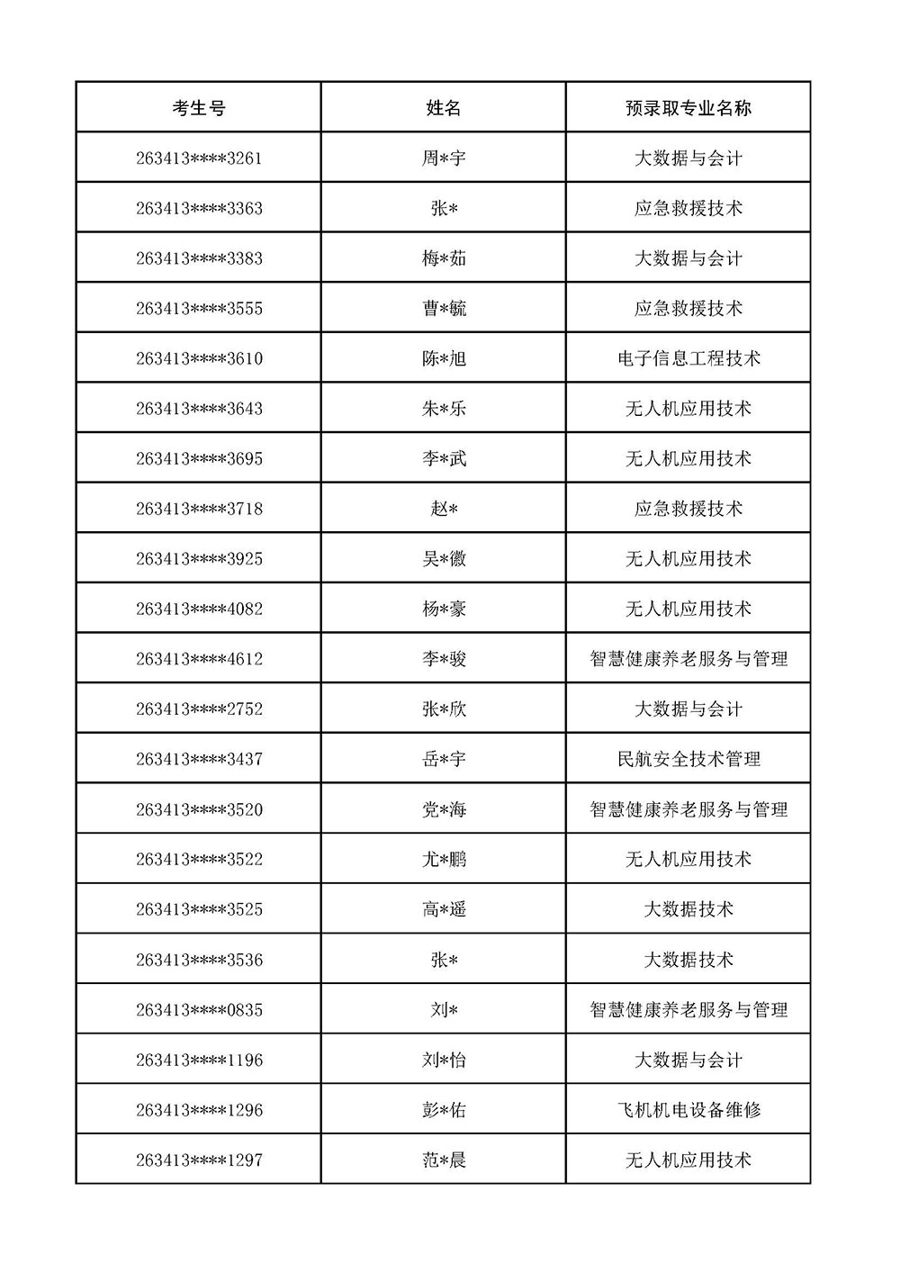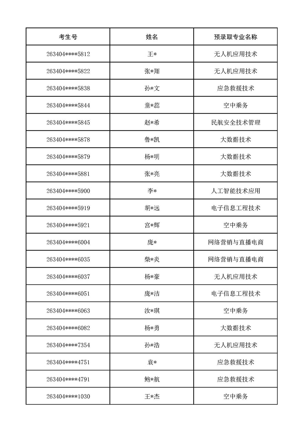 根据《宿州航空职业学院2026年高职院校分类考试招生章程》有关规定,现将预录取名单公示如下,如有异议,请拨打电话0557-2352888,公示时间:2026年4月4日—4月6日。