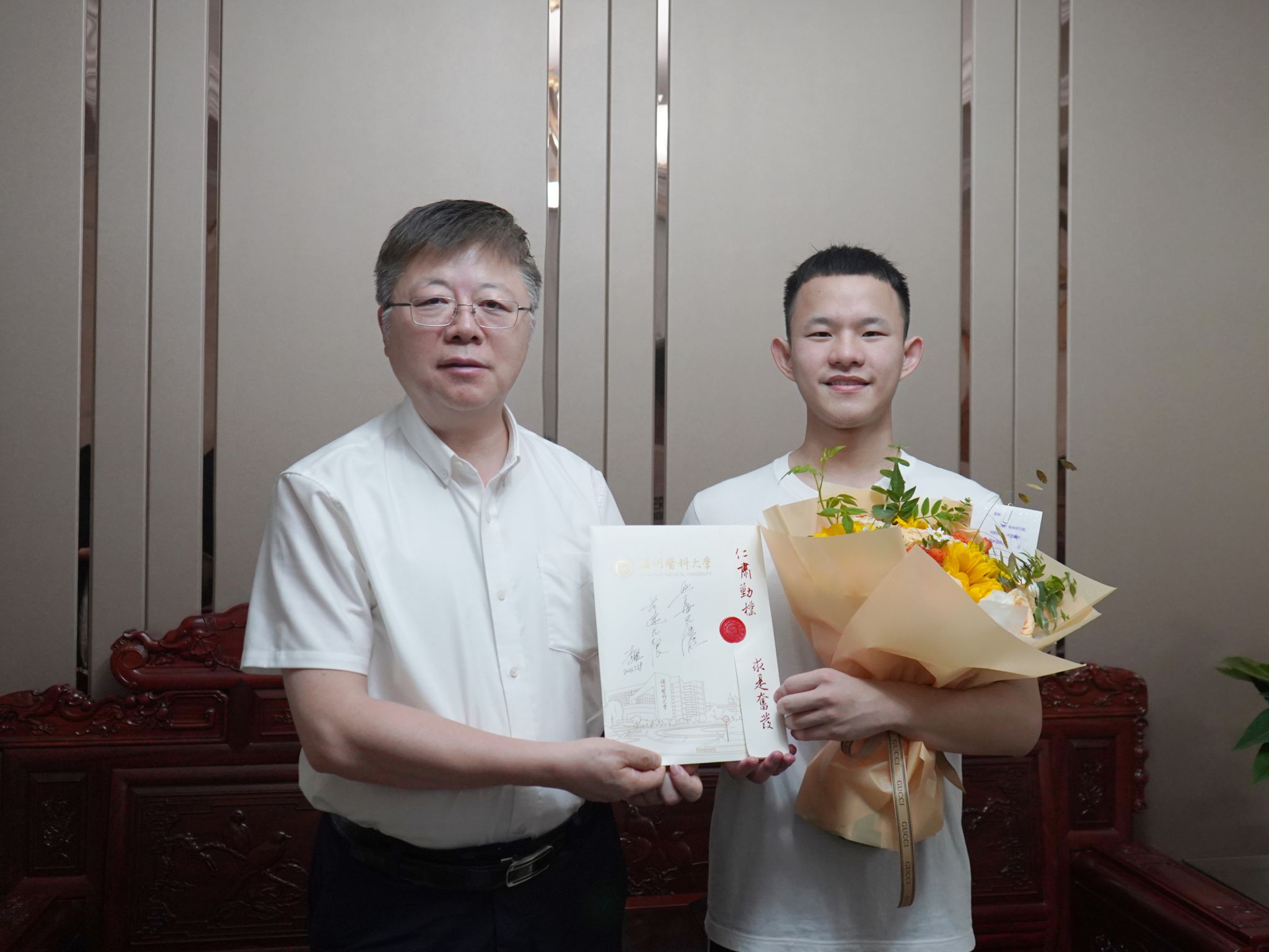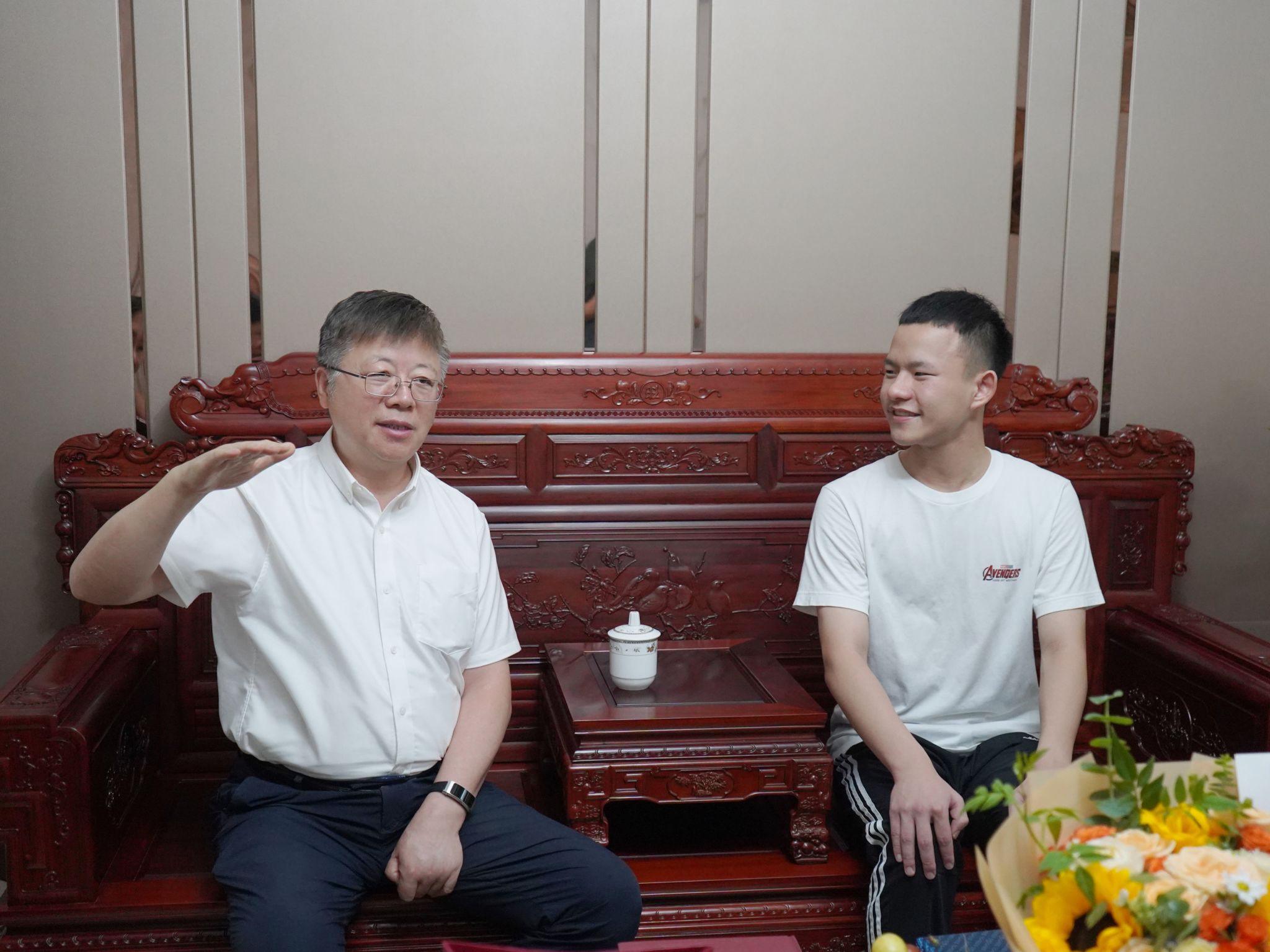 现场,李校堃向陈熠寒表达了祝贺,欢迎他来到温医大这个大家庭,并与学生亲切交谈,简要介绍了学校的历史、专业特色等。李校堃说:“身为你们的‘大家长’,我们承担的就是‘引路人’的角色,温医大将提供丰富的课程教学和科研学术资源,引导学生尽早做好大学规划,努力缩短入学适应期,踔厉奋发,成长为卓越的医学人才。”