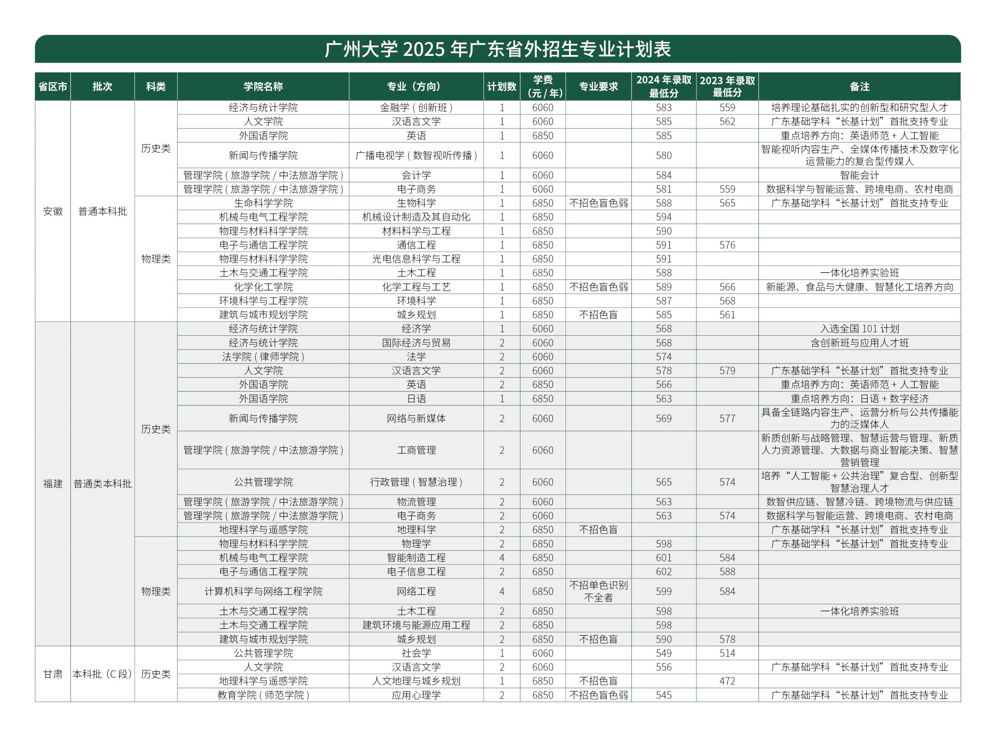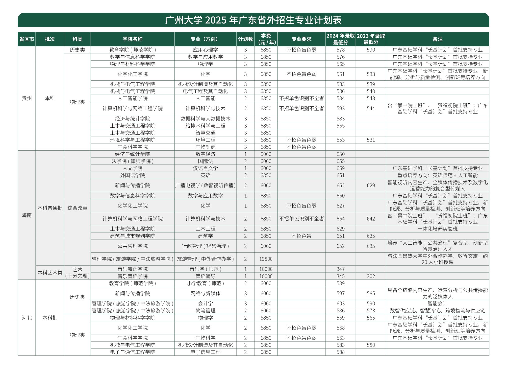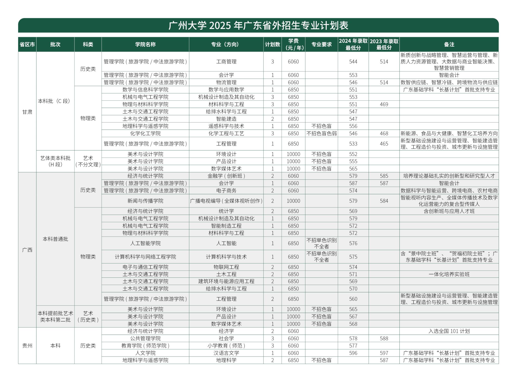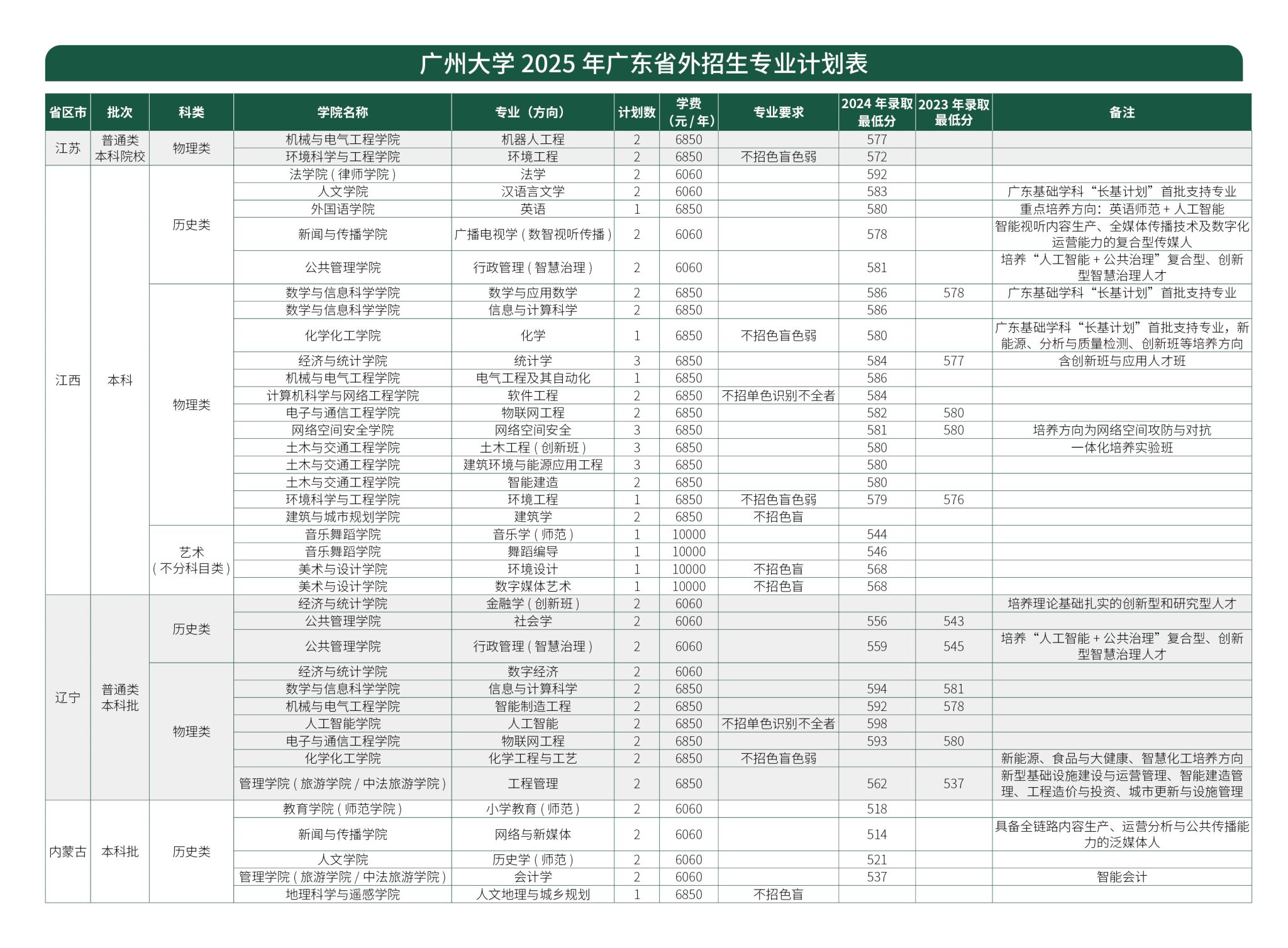 广州大学2025年广东省外招生专业计划表