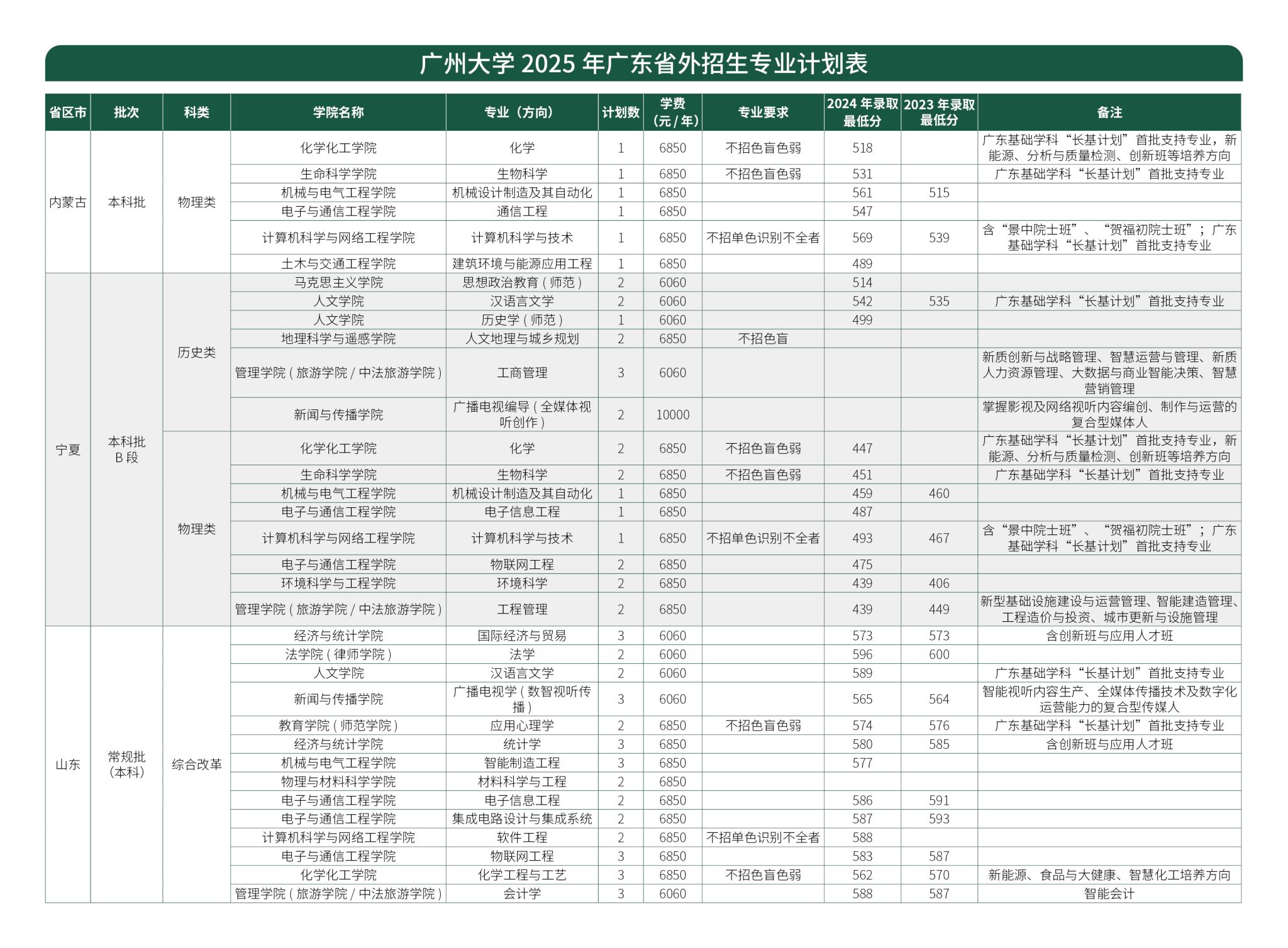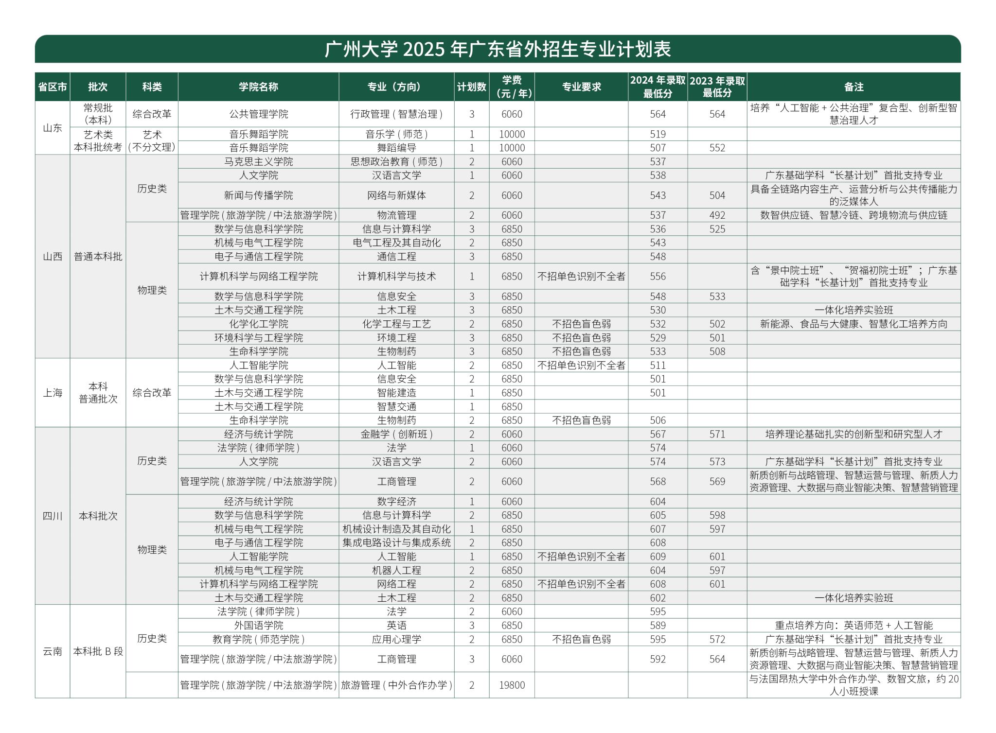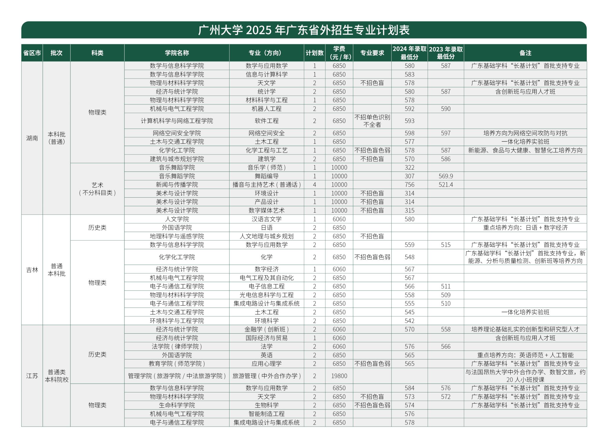 广州大学2025年广东省外招生专业计划表
