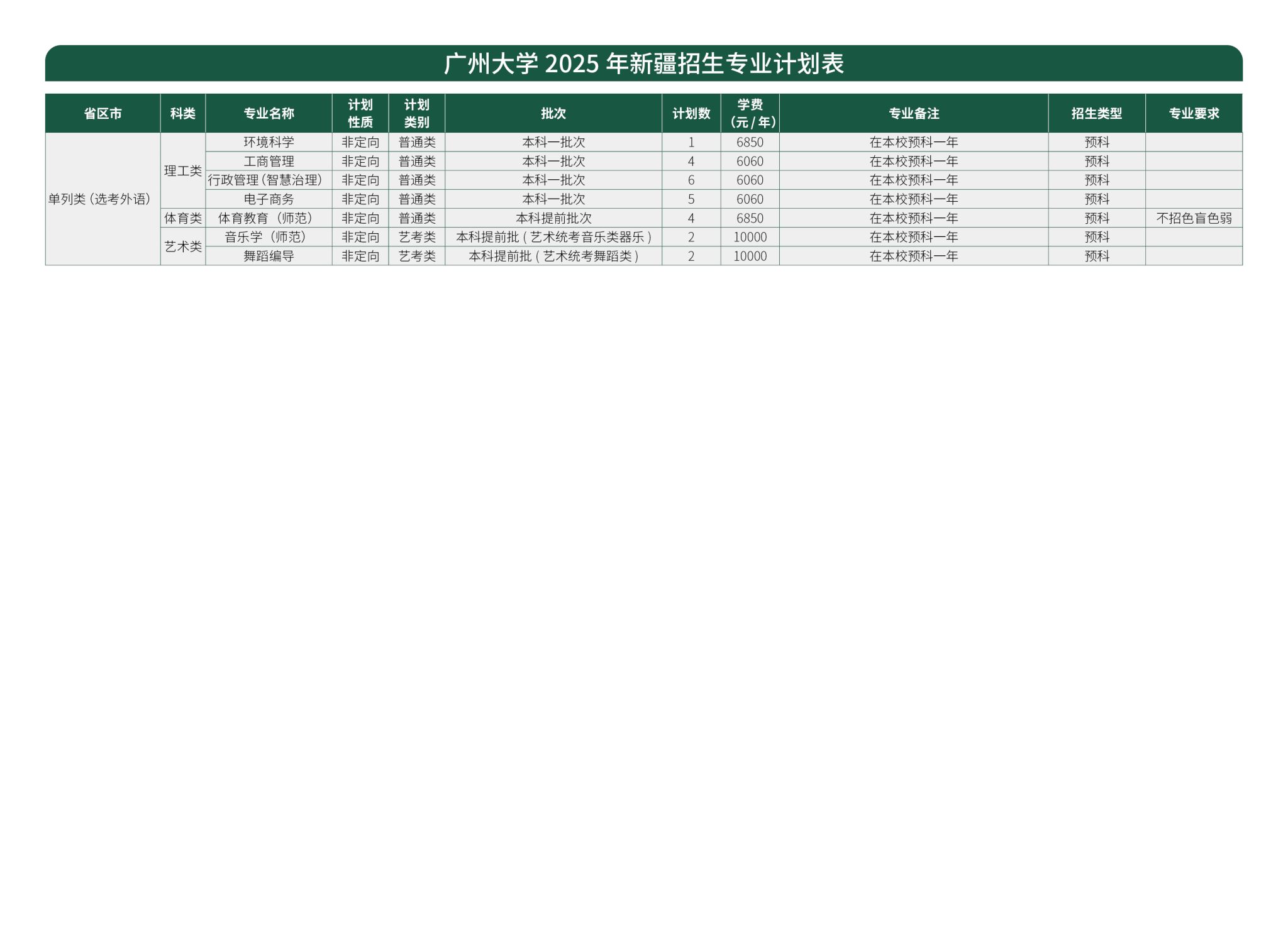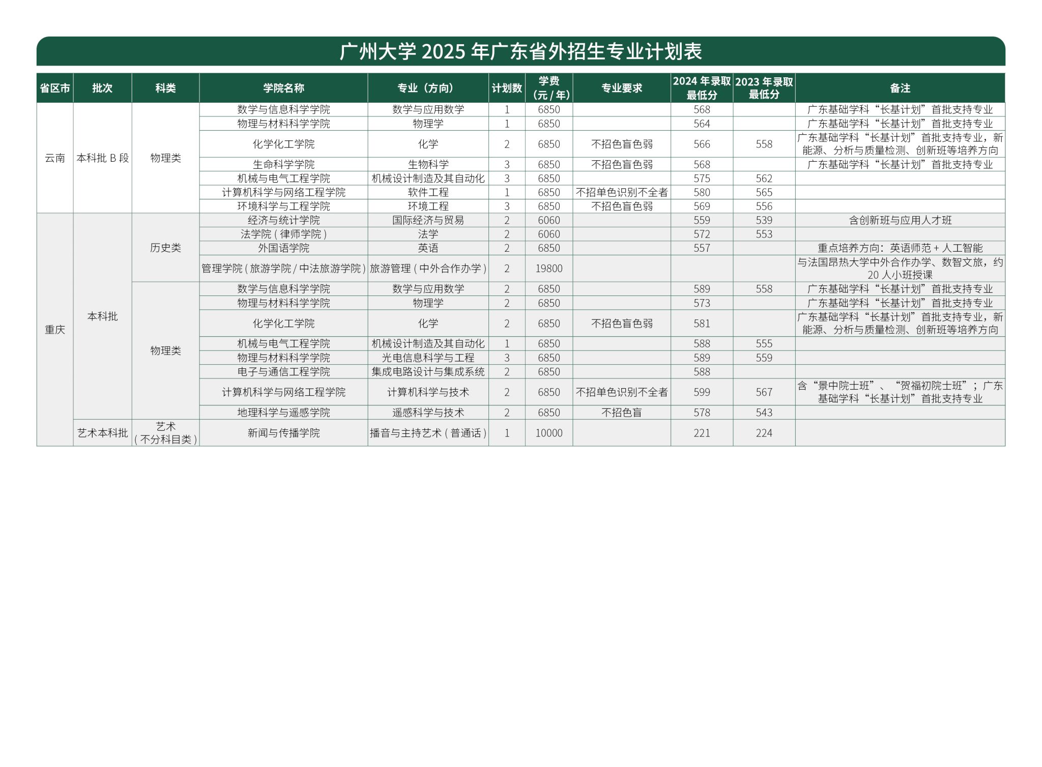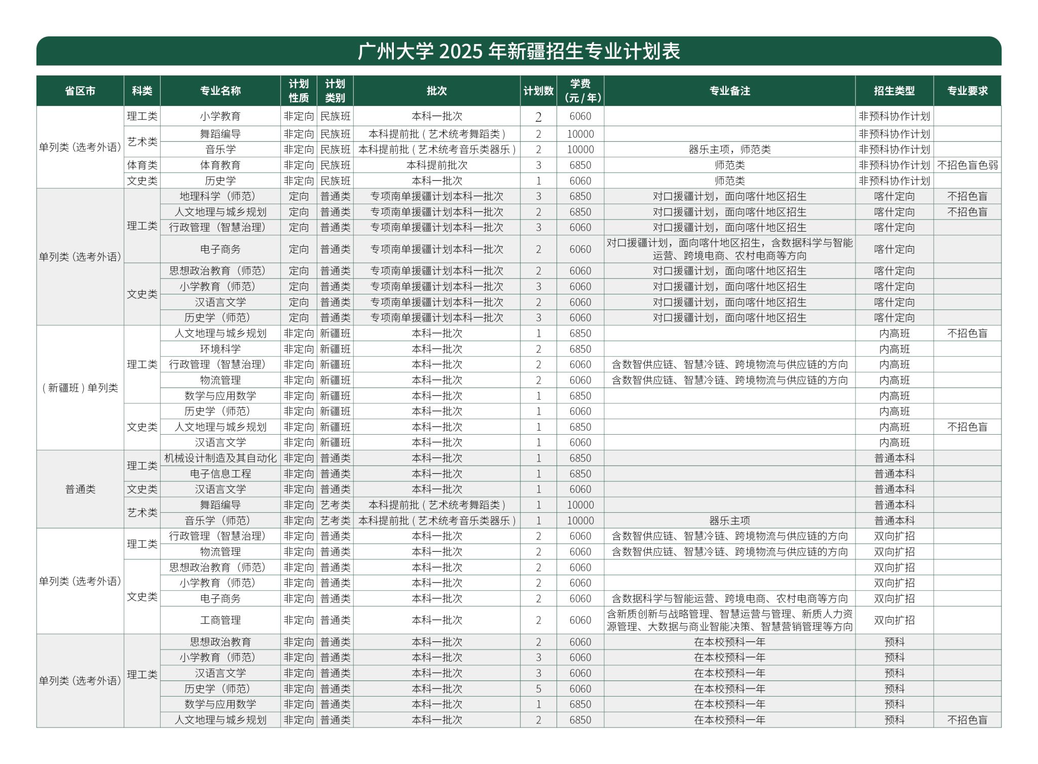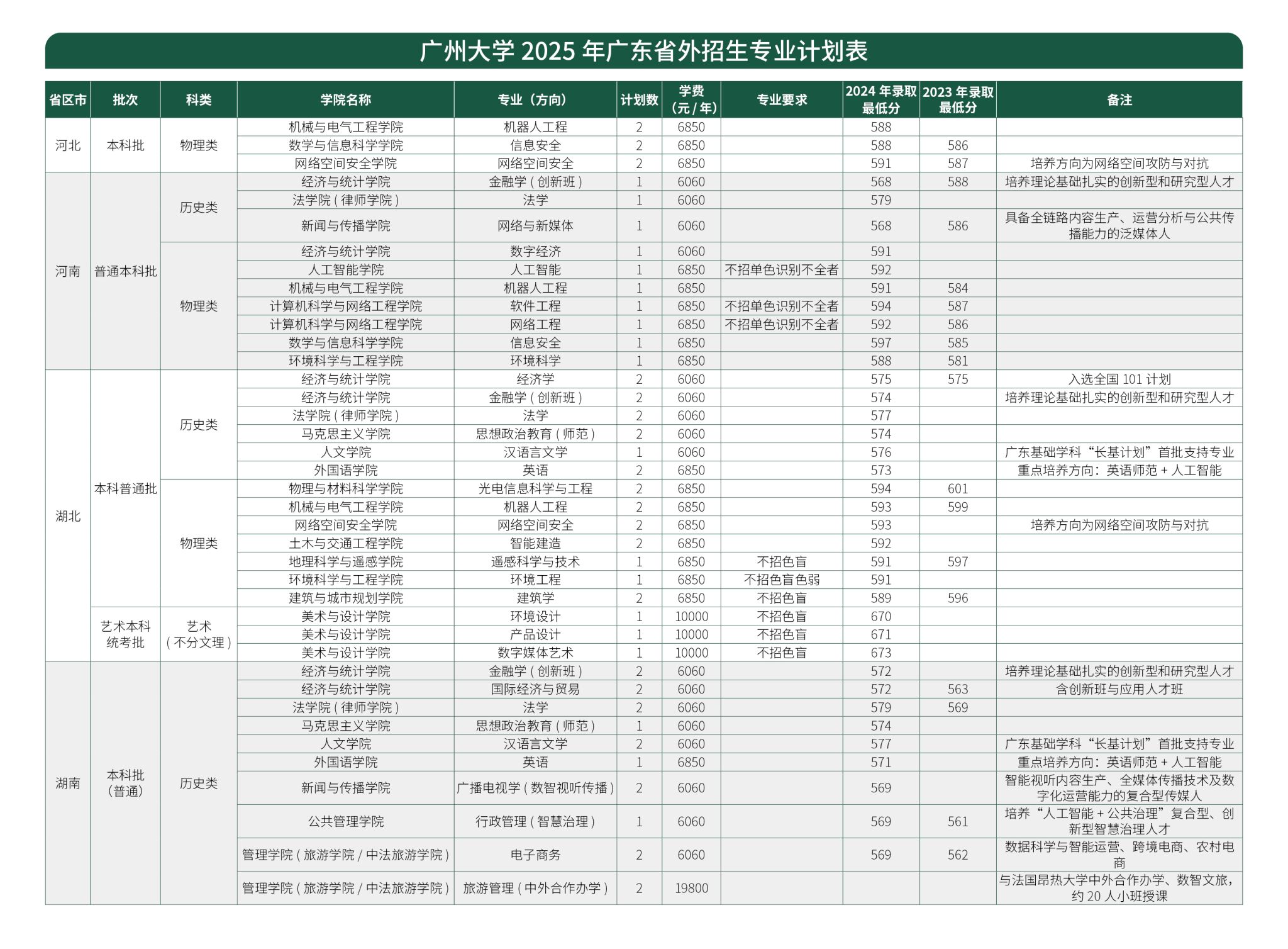 广州大学2025年广东省外招生专业计划表