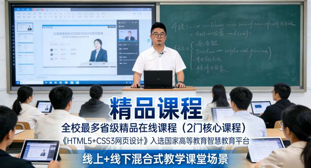 精品课程:拥有全校最多省级精品在线课程(2 门核心课程),其中《HTML5+CSS3 网页设计》入选国家高等教育智慧教育平台,线上 + 线下混合式教学,学习更高效;