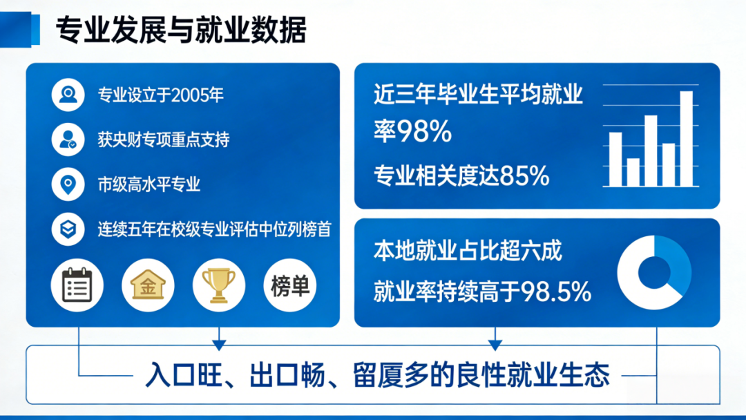 专业设立于 2005 年,获央财专项重点支持,是市级高水平专业,连续五年在校级专业评估中位列榜首,近三年毕业生平均就业率 98%,专业相关度达 85%,本地就业占比超六成,形成 “入口旺、出口畅、留厦多” 的良性就业生态,就业率持续高于 98.5%,用数据诠释专业硬实力!