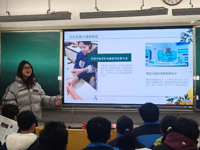 宣讲开始,我先播放了宣传短片:黄家湖校区的晨光、图书馆的灯火、药园里的百草......每一帧都引来轻声的惊叹。随后,我用PPT系统介绍了学校概况、特色专业和就业前景,重点解读中医学、针灸推拿学、中药学等特色专业。当讲到“中医专业要读《黄帝内经》、背四百味中药歌诀”时,引起了学弟学妹们的阵阵惊叹声。