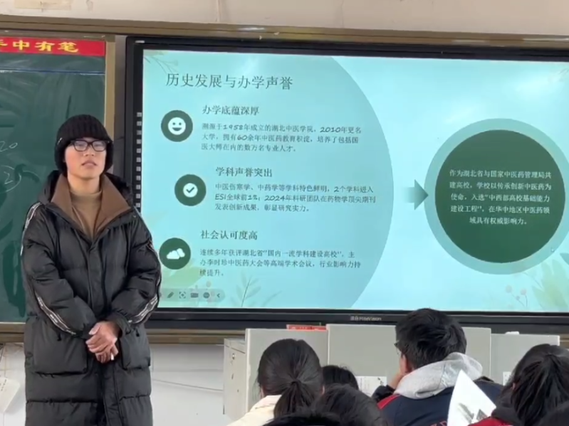 作为湖北中医药大学中西医临床专业的学生,这个寒假我有幸以“招生大使”的身份回到母校高中,向学弟学妹们介绍我的大学。