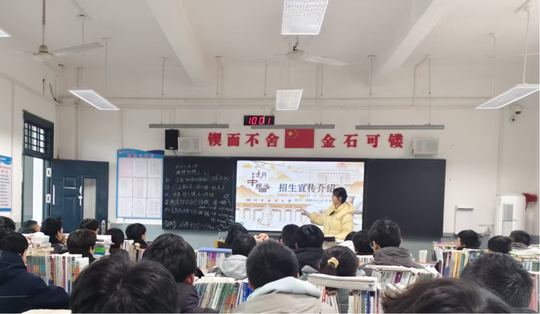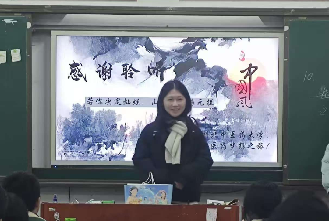 我在高中班主任的安排下,走进高三教室,将大学宣传册、报考指南等资料发给大家。宣讲正式开始,我结合PPT,从学校的历史底蕴、学科实力讲起,重点介绍了优势专业、培养特色和近年录取情况,并分享了自己在大学的学习生活与成长收获。学弟学妹们听得专注,不时在笔记本上记录。台下的同学们专注聆听,互动环节更是气氛热烈。他们踊跃提问,有的好奇中医学习的独特方法,有的关心专业的未来发展,更有同学眼中闪烁着对中医的浓厚兴趣,直言立志传承国粹。看着他们眼中流露出的向往与求知欲,我深切感受到了中医药文化的独特魅力,也为能成为传递中医药火种的“引路人”而倍感自豪。