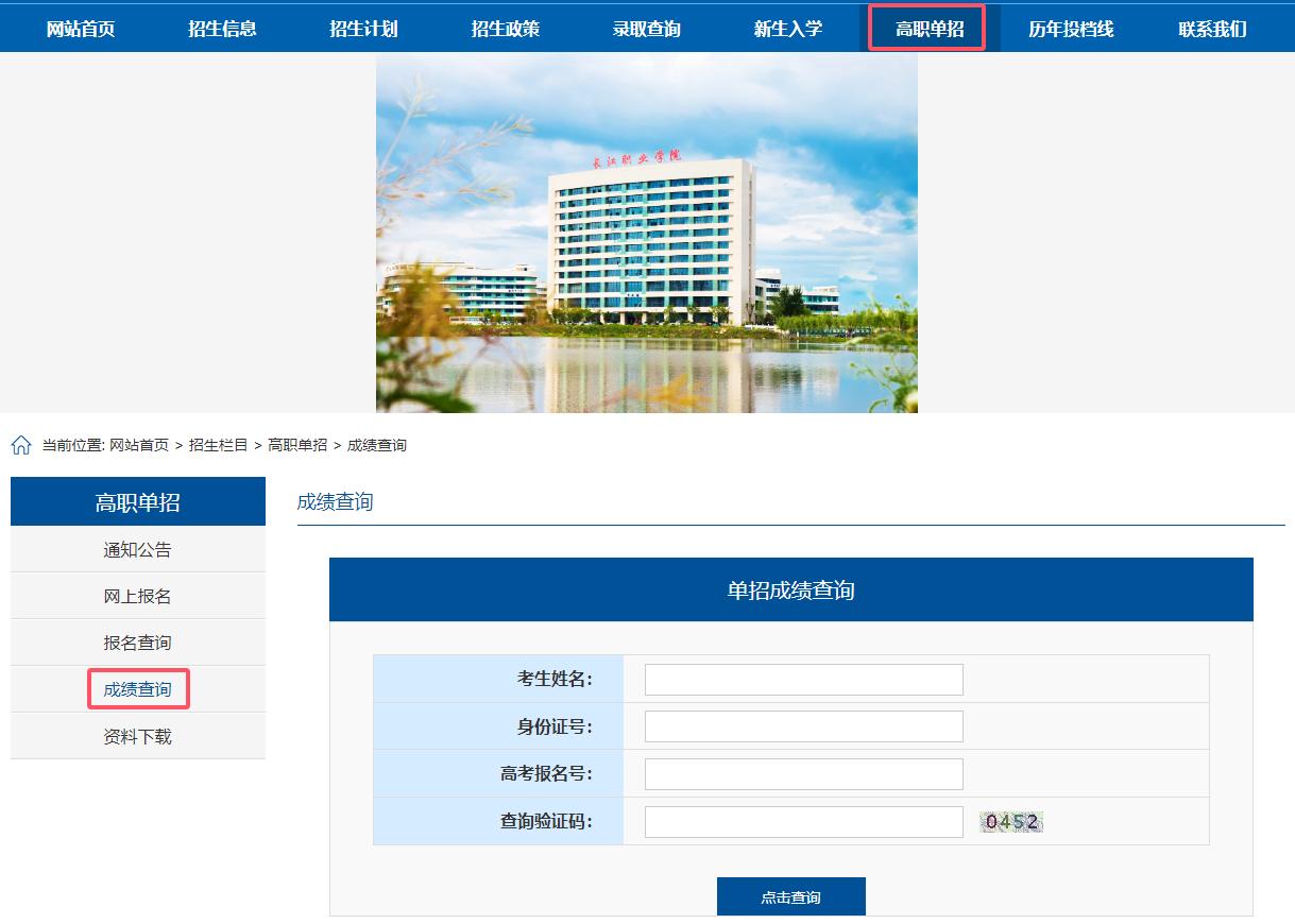 请考生进入长江职业学院招生信息网-高职单招成绩查询栏目(http://zsjy.cjxy.edu.cn/zslm/gzdz/cjcx.htm),在指定位置输入姓名、身份证号码、高考报名号查询考试成绩。