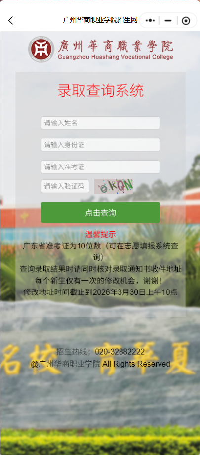 2. 进入广州华商职业学院招生网→点击信息查询→录取查询→输入姓名、身份证号、准考证号(10位数,可在志愿填报系统查询)和验证码,点击查询录取信息。