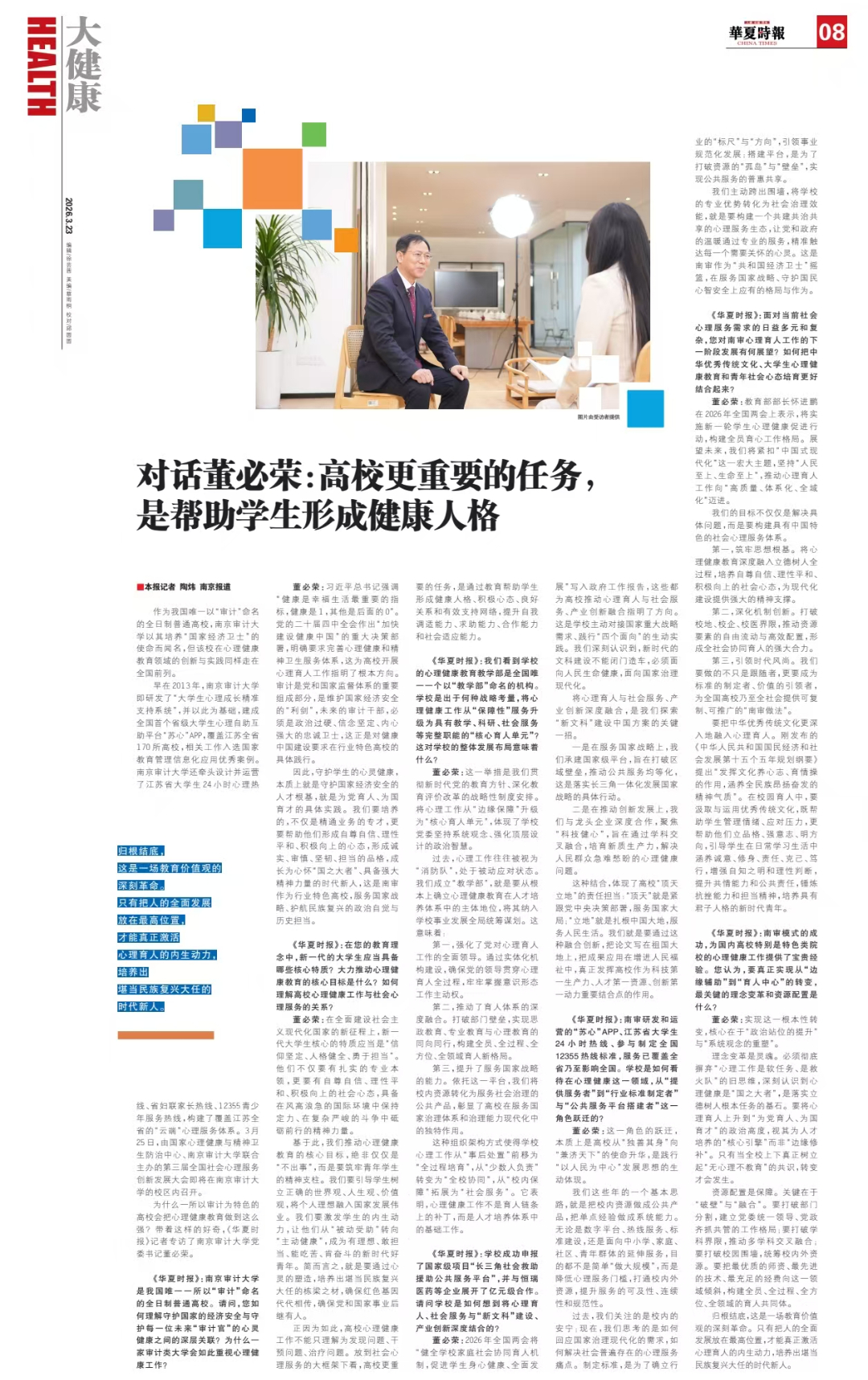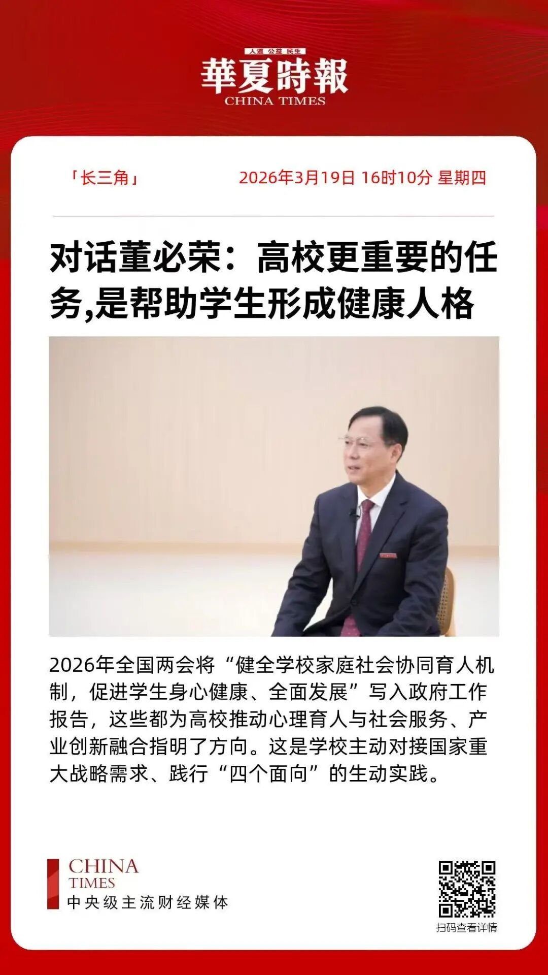 近日,华夏时报以“对话董必荣:高校更重要的任务,是帮助学生形成健康人格”为题,对我校党委书记董必荣进行了深度专访。报道聚焦我校在心理育人领域的战略布局与实践成效,探讨了一所以审计为特色的高校,为何能将心理健康教育做到全国前列。