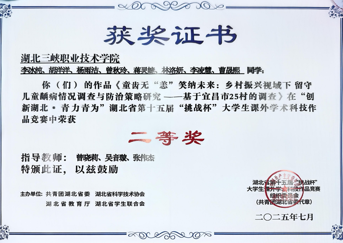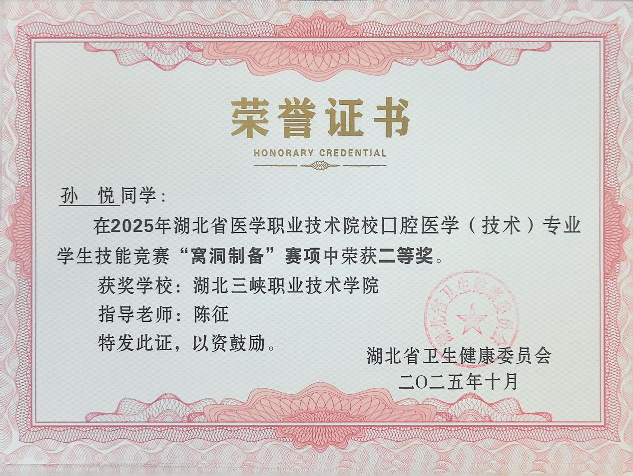 2024年,在世界职业院校技能大赛中获银奖;2024年,在全国职业院校口腔技能大赛中,获二等奖1项、三等奖3项;2023年,在湖北省医学职业教育口腔医学技能竞赛中,获二等奖3项、三等奖4项;2023年,在全国职业院校口腔技能大赛中,获一等奖1项、二等奖5项、三等奖1项。