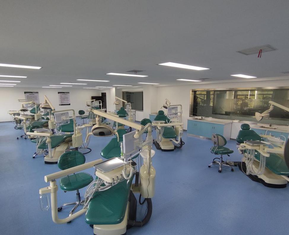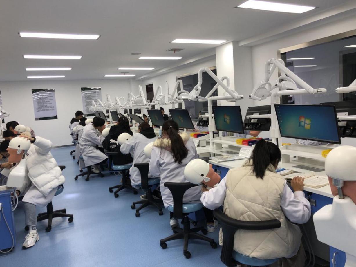 建设有仿真头模模拟实训室、口腔修复实训室、口腔内科实训室、口腔颌面外科实训室、消毒室等10个一体化实训室,配备仿真头模、技工桌、牙科综合治疗椅、临床模拟示教系统、临床教学模型、热牙胶充填系统等设备,建立与临床无缝对接、全方位模拟的诊疗环境,为口腔医学的实训教学提供充分的保障。