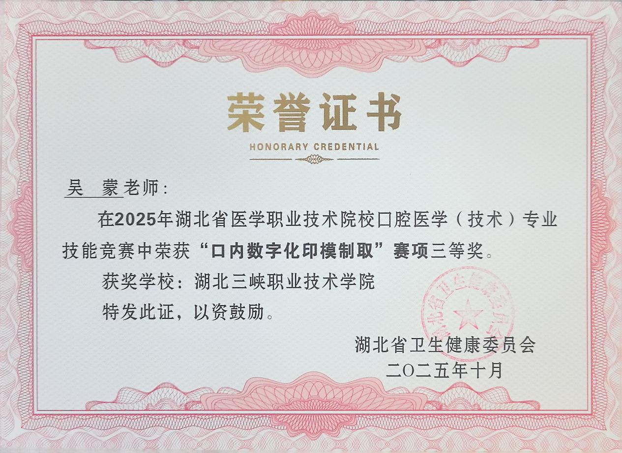 2025年,在中华人民共和国第三届职业技能大赛口腔修复工艺技术赛项中获金牌;2025年,在全国卫生职业院校口腔医学技术操作技能展示中,荣获个人评审口内数字化印模制取和数字化固定桥修复设计二等奖;2025年,在湖北省医学职业技术学院口腔医学(技术)专业学生技能竞赛中,“窝洞制备”“牙体预备”“全口排牙”“口内数字化印模制取”赛项二等奖、“牙体雕刻”赛项获三等奖。