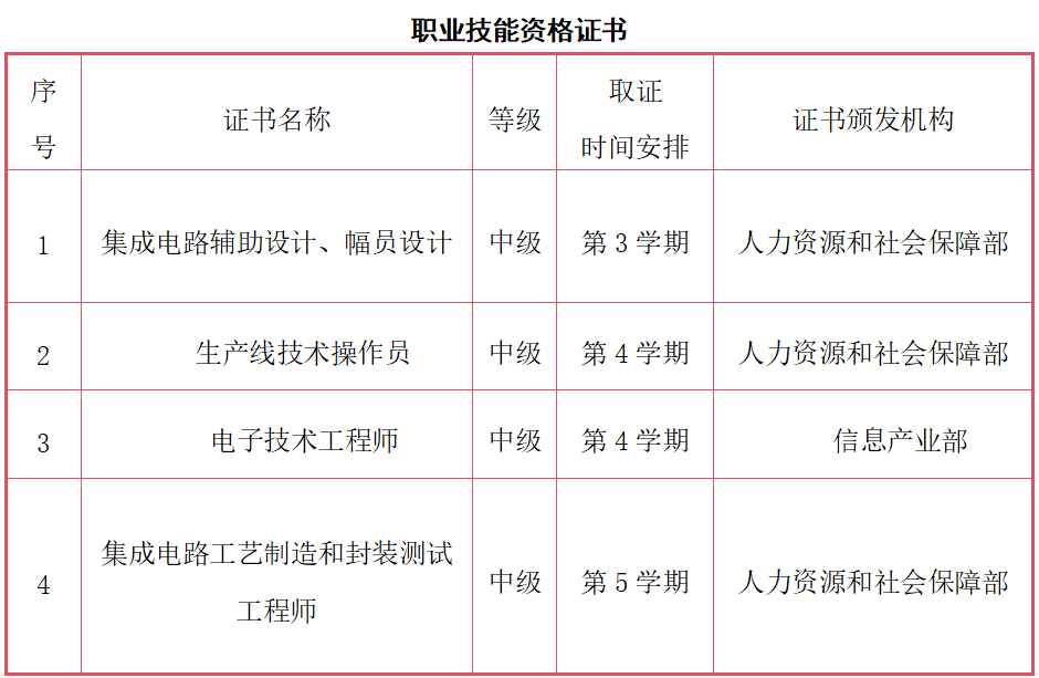 本专业培养理想信念坚定,德、智、体、美、劳全面发展,掌握扎实的科学文化基础和集成电路设计、集成电路制造工艺和封装测试等知识,具备集成电路辅助设计和版图设计、芯片应用开发和FPGA开发、集成电路制造及封测工艺维护等能力,具有工匠精神和职业素养,能够从事芯片版图设计、芯片验证及应用方案开发、芯片制造与封测工艺管理,以及产品检验、产品营销等工作的高素质技术技能人才。