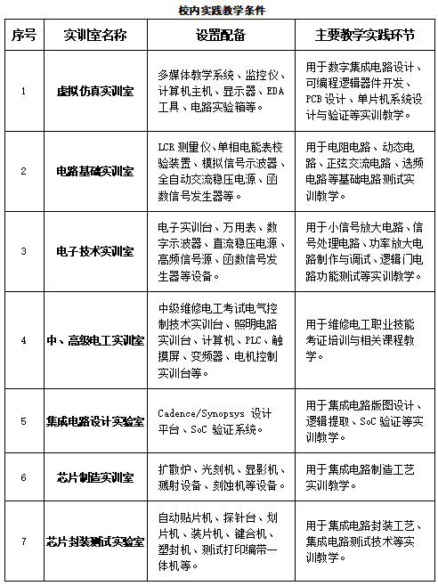 专业配备虚拟仿真实训室、集成电路设计实验室、芯片封装测试实验室等现代化教学设施,围绕集成电路设计、制造、封测等关键环节,开展系统化实训,帮助学生掌握岗位所需基本技能与实操能力。