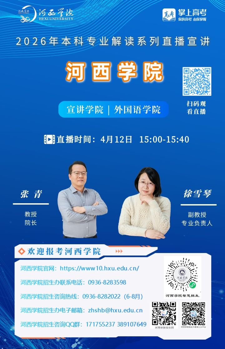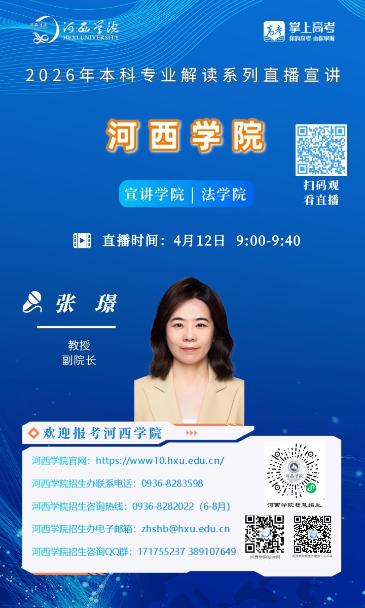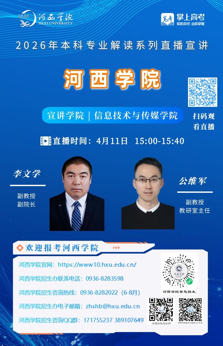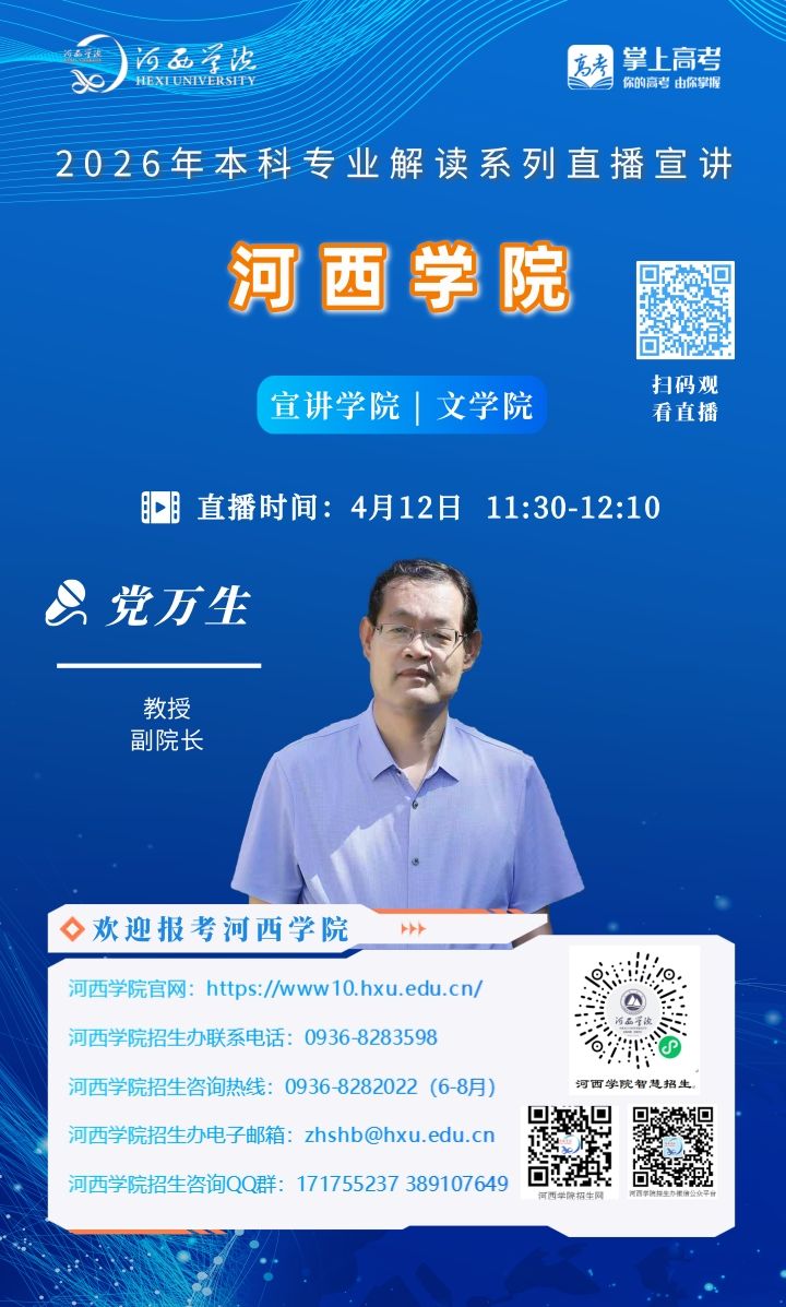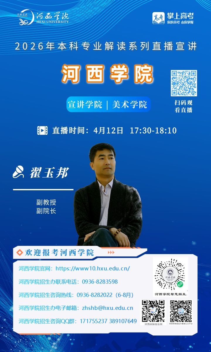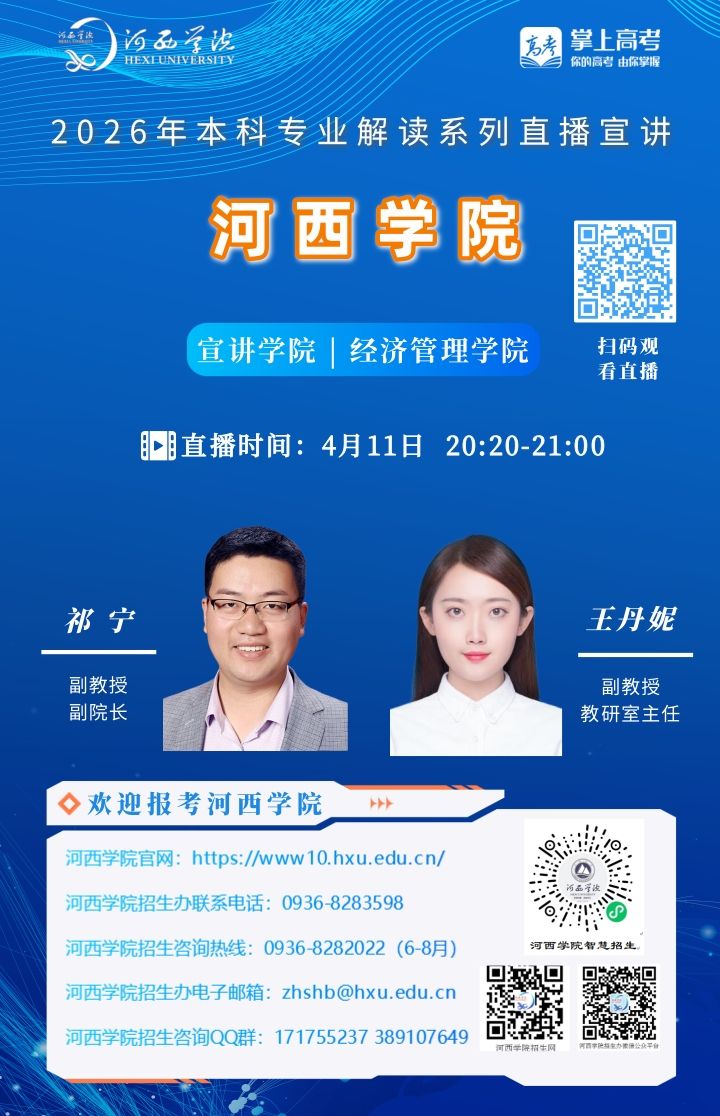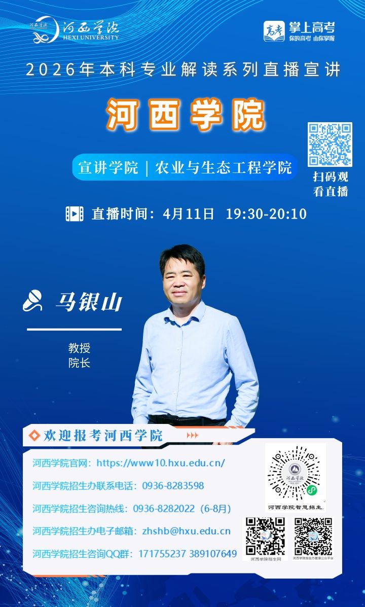 可扫描海报上的二维码观看,河西学院招生办微信视频号将同步直播。
