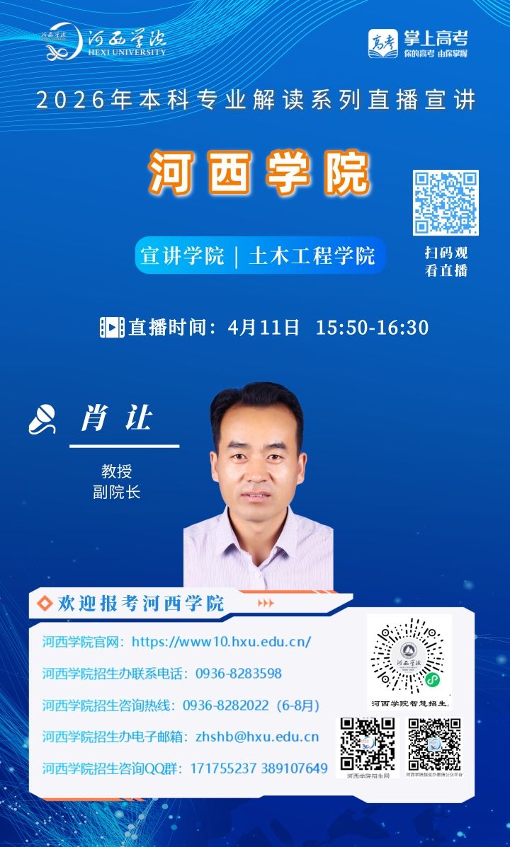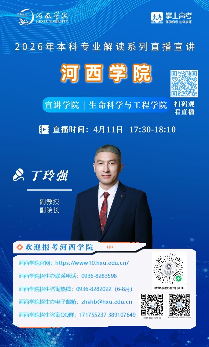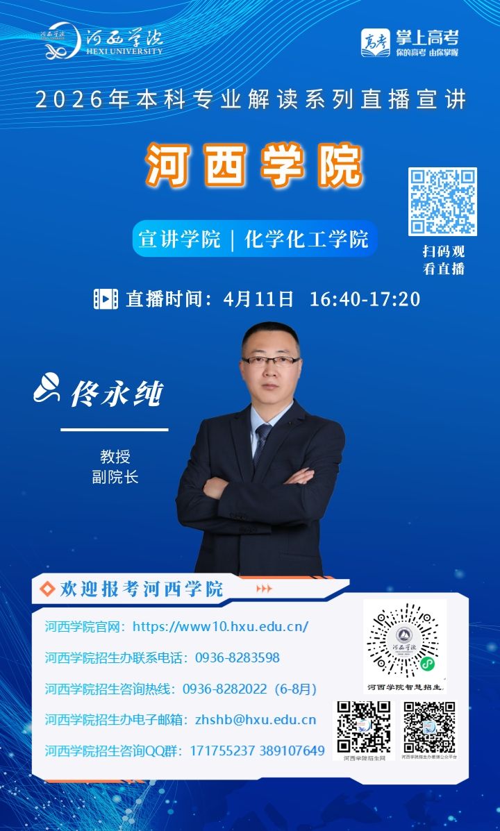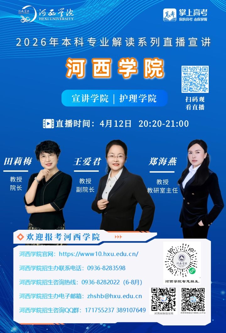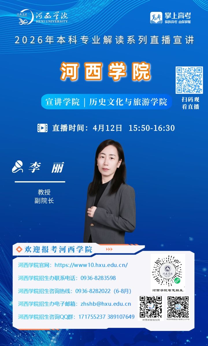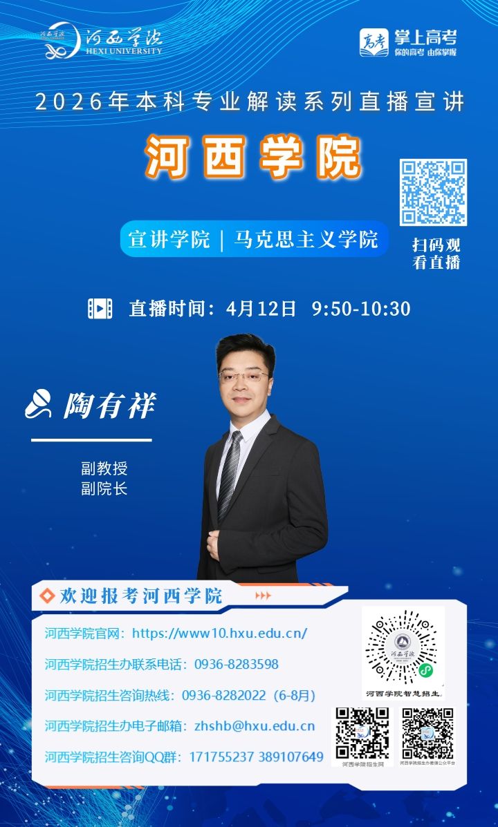 可扫描海报上的二维码观看,河西学院招生办微信视频号将同步直播。
