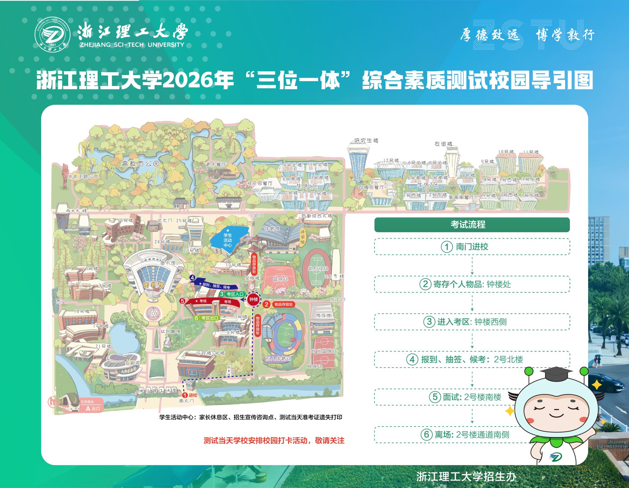 9.我校在学生活动中心一楼小剧院设家长休息区、学生活动中心设各学院招生宣传咨询点,另有校园打卡、特色实验室参观等活动,请按工作人员引导有序参加。