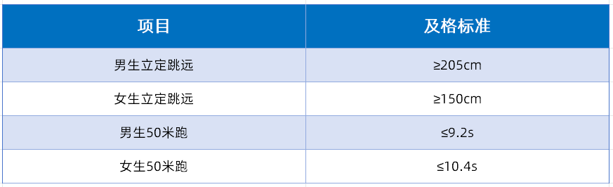 测试项目可自主选择立定跳远或50米跑,不受理缓考、补考申请,体测及格标准如下。