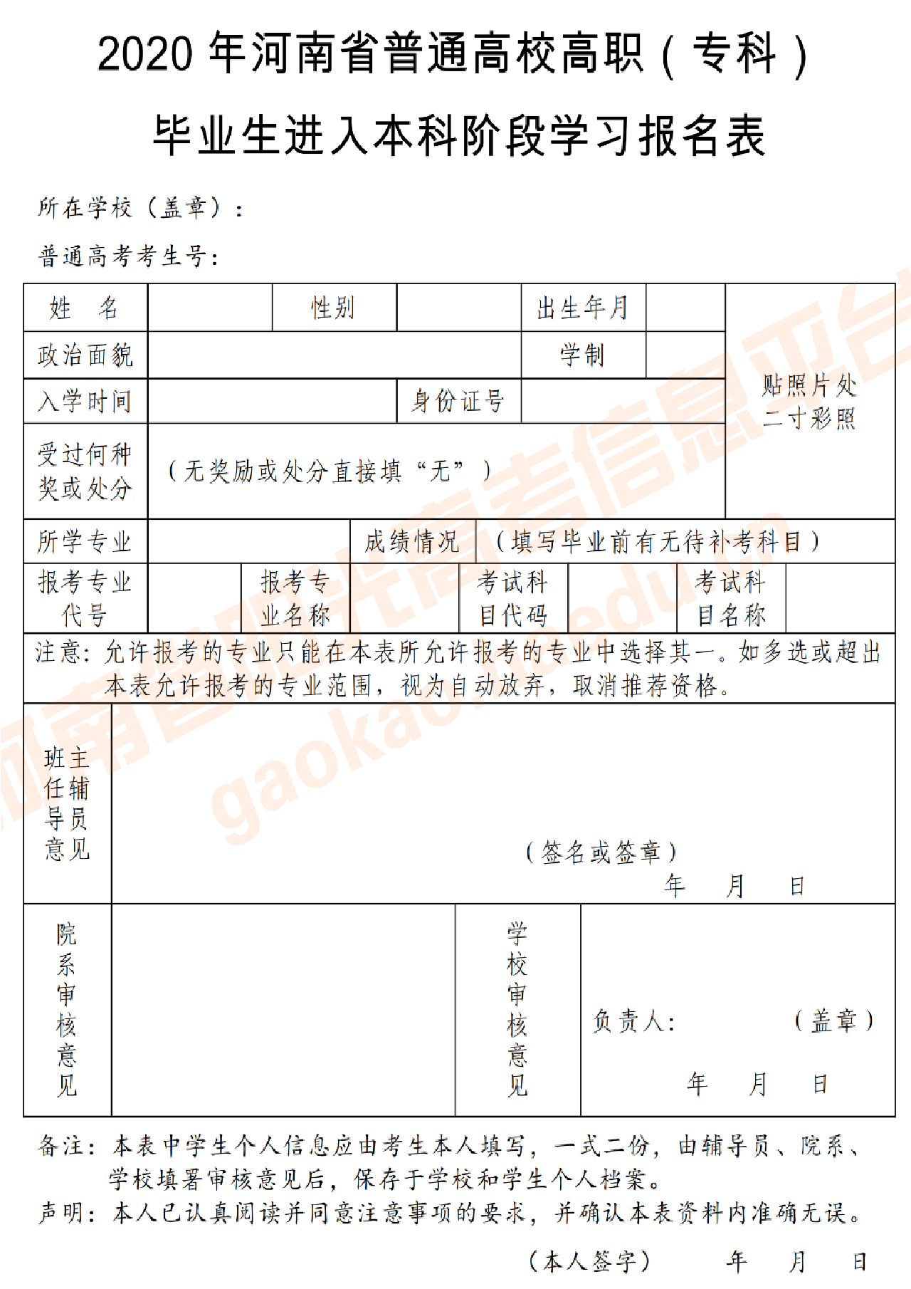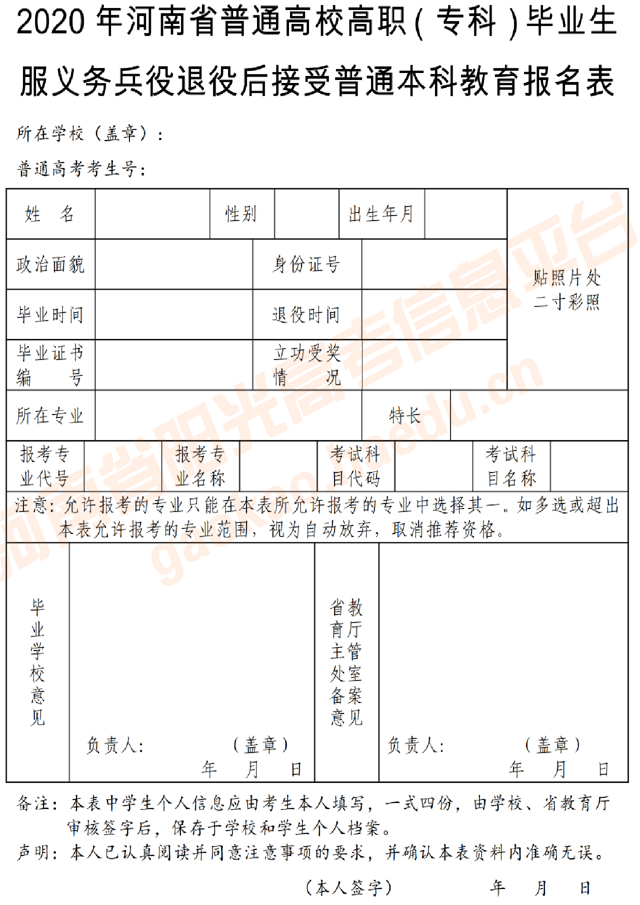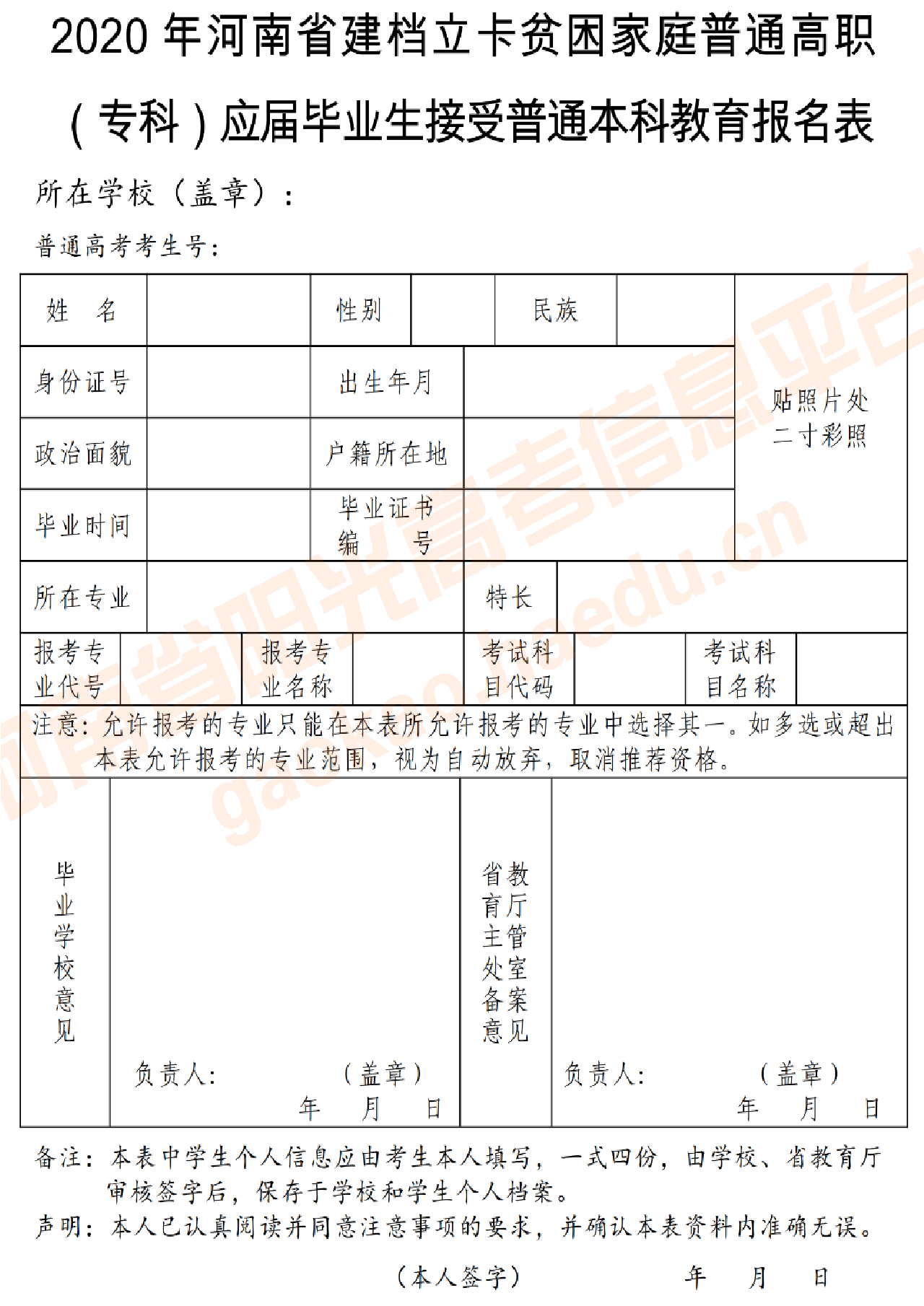 符合报名条件的考生,可参加全省2020年普通高校招生考试报名、信息采集和现场确认,并按照本、专科专业对照要求选择报考专业,填写《2020年河南省普通高校高职(专科)毕业生进入本科阶段学习报名表》(见附件3)。退役士兵填写《2020年河南省普通高校高职(专科)毕业生服义务兵役退役后接受普通本科教育报名表》(见附件4)。建档立卡贫困家庭普通高职(专科)应届毕业生填写《2020年河南省建档立卡贫困家庭普通高职(专科)应届毕业生接受普通本科教育报名表》(见附件5)。