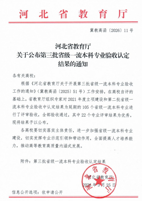 近日,河北省教育厅印发《关于公布第三批省级一流本科专业验收认定结果的通知》(冀教高函〔2026〕11号),我校财务管理专业顺利通过第三批省级一流本科专业验收认定,专业建设成效获省教育厅充分肯定,标志着该专业建设水平迈上新台阶。