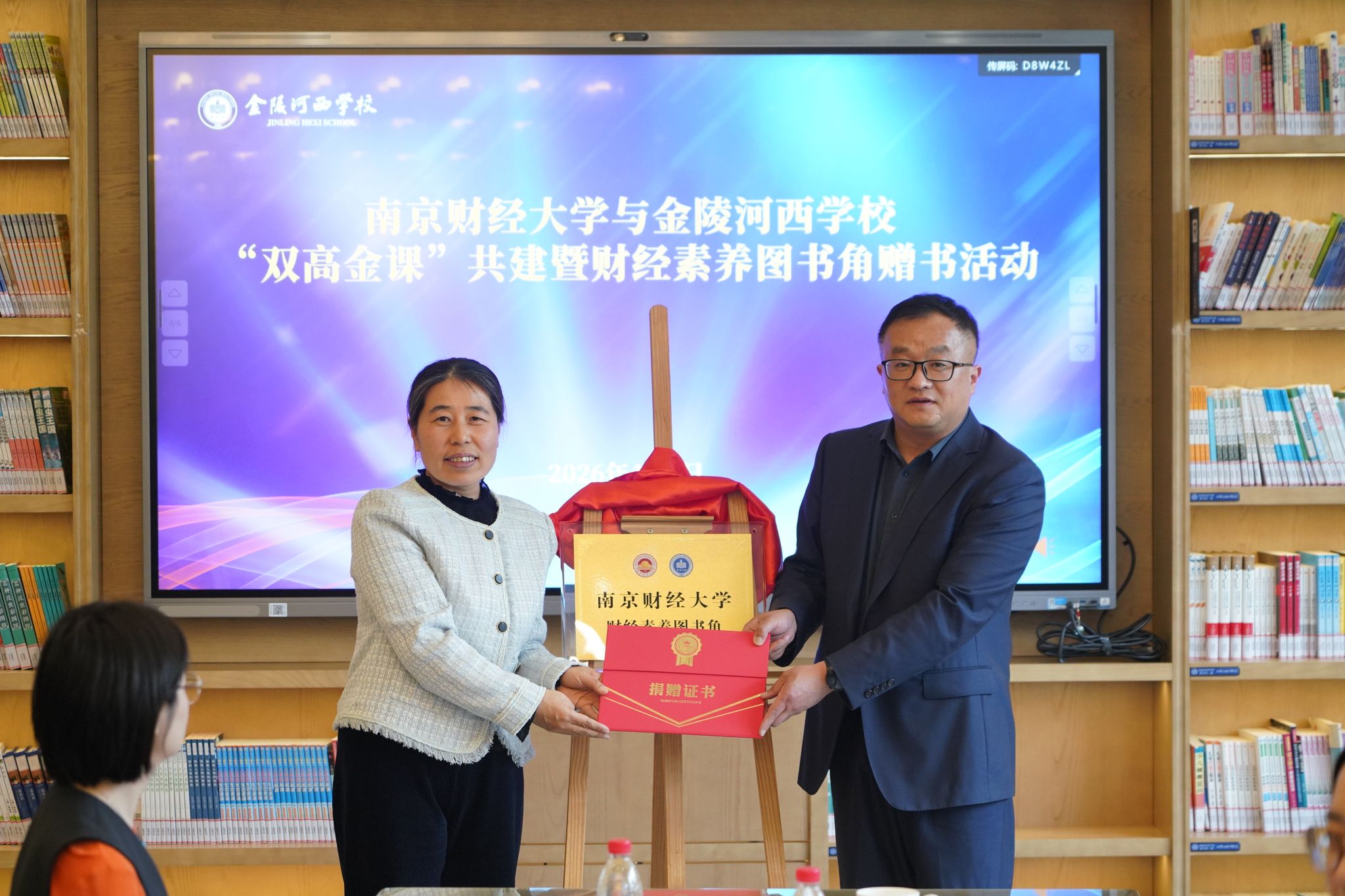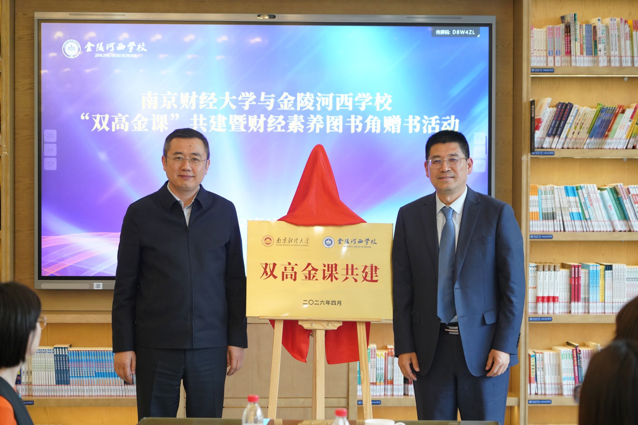 活动现场,张杰书记代表学校向金陵河西学校捐赠财经素养类精品图书,双方共同为“南京财经大学财经素养图书角”揭牌。