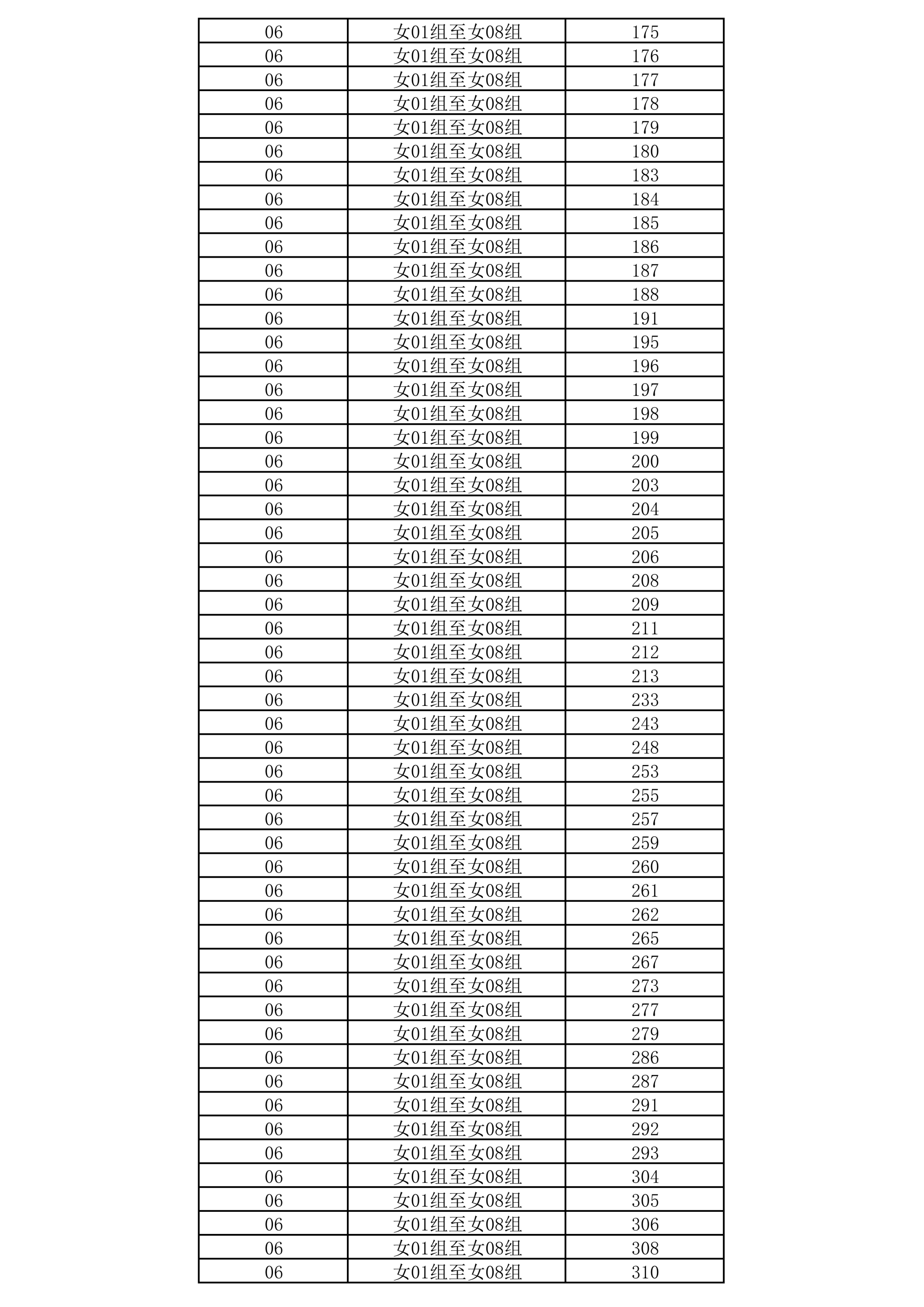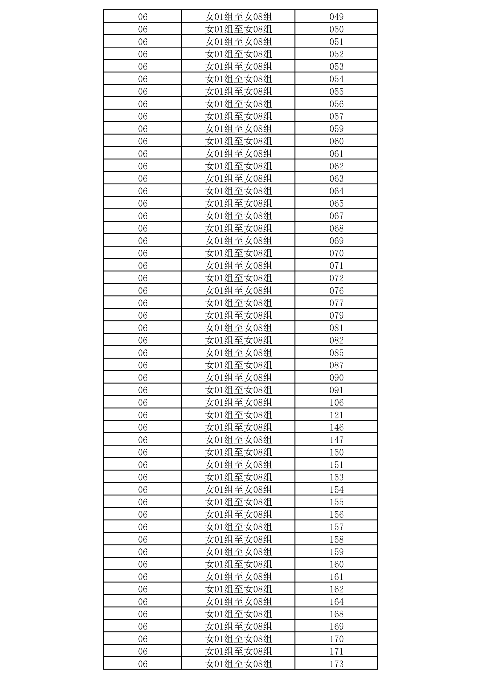 06 | 女 | 女01组至女08组 | 8 | 09:30 | 10:00 | |