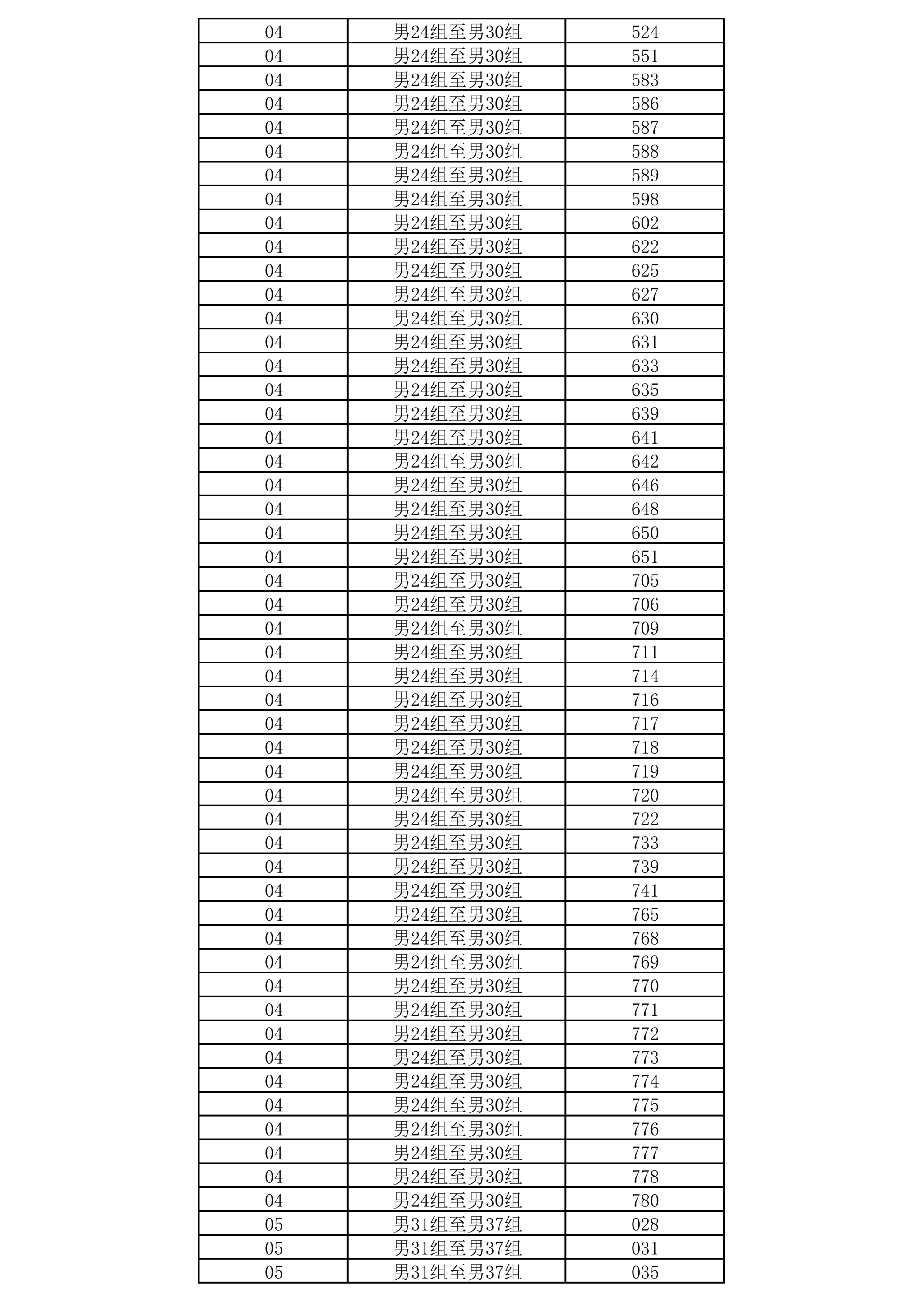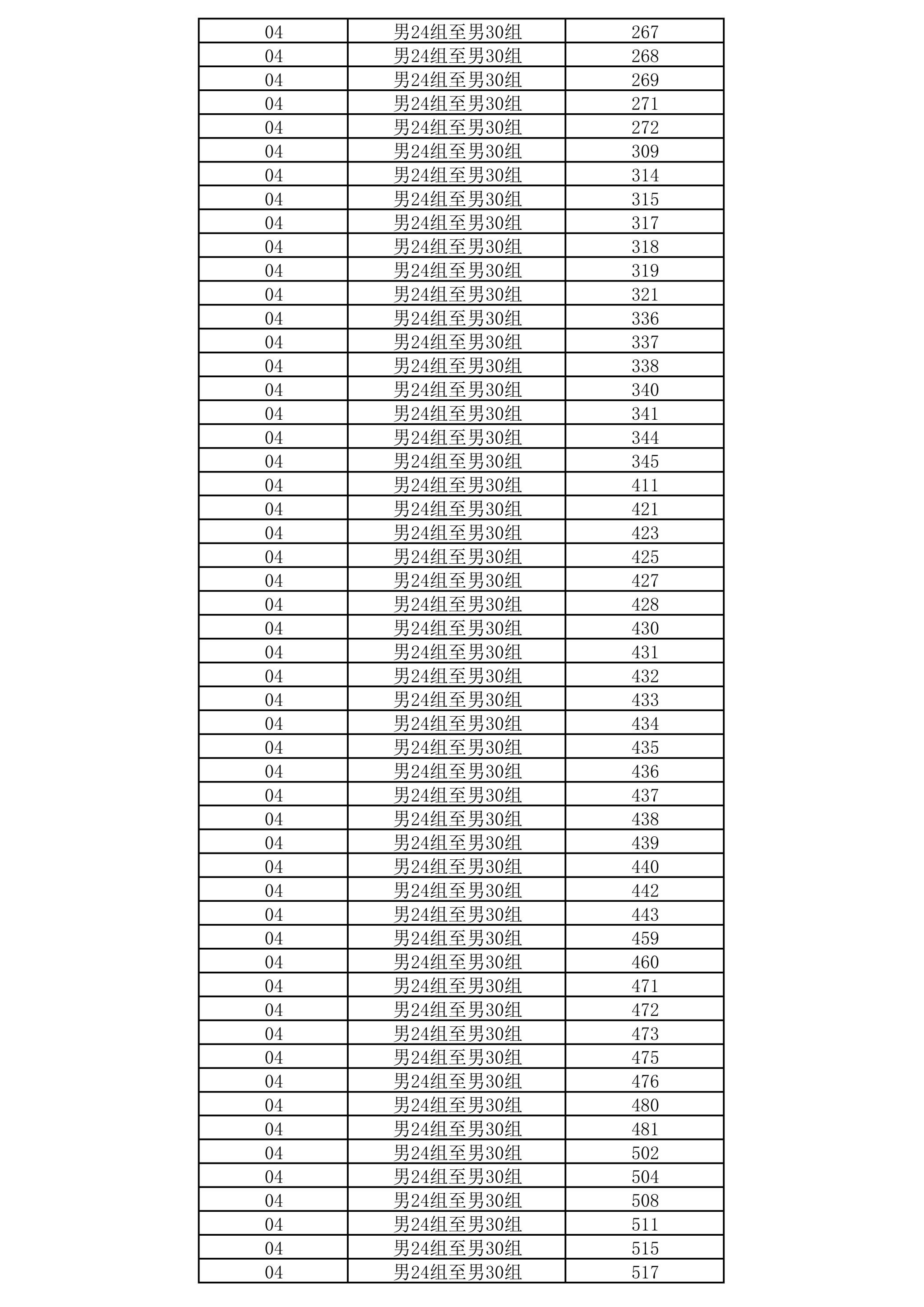 04 | 男 | 男24组至男30组 | 7 | 14:30 | 15:00 | |