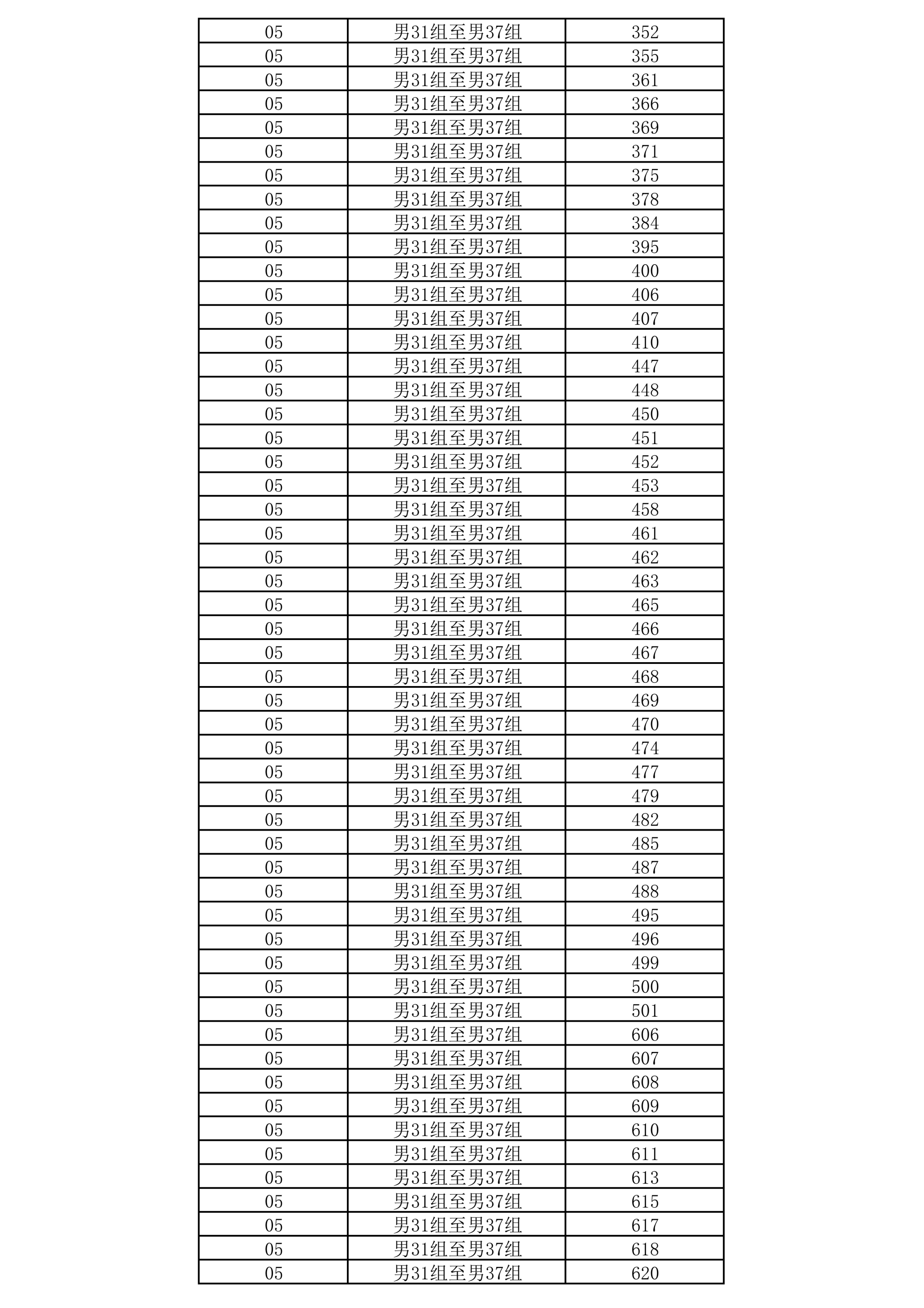 4月12日 (周日) | 05 | 男 | 男31组至男37组 | 7 | 07:30 | 08:00 |