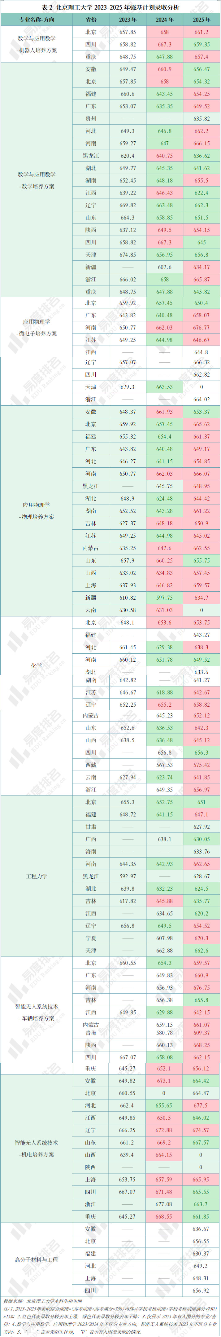 从近三年最低录取分的变化趋势来看,各专业方向呈现出不同特征。其中,应用物理学和化学专业2025年的录取分数整体呈上涨态势。智能无人系统技术专业则因培养方案不同而有所分化:车辆培养方案方向2025年在多个省份的最低录取分有所上升;而机电培养方案方向则在较多省份出现录取分数下降的情况。