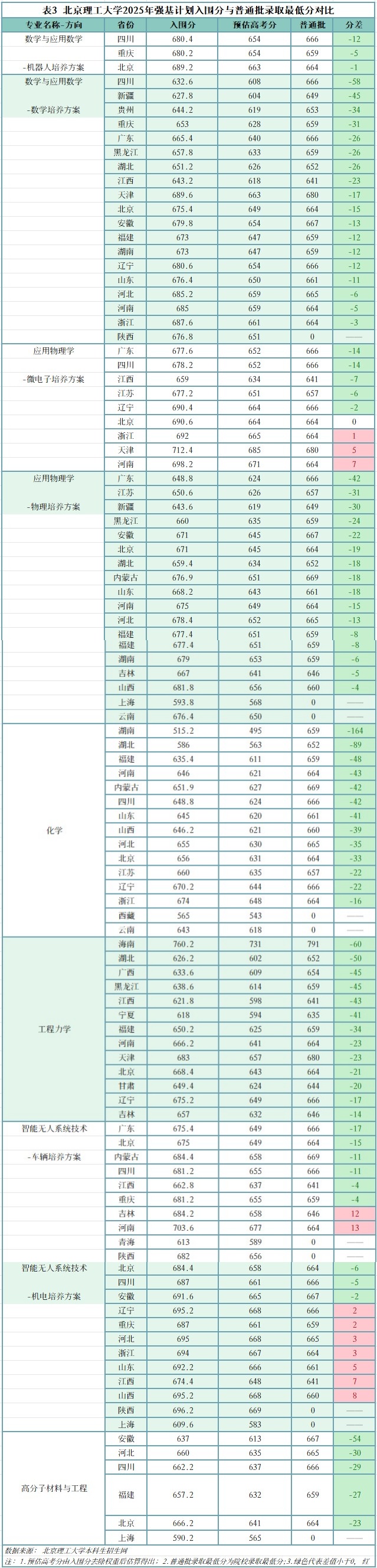 北京理工大学2025年强基计划各省份的预估高考分普遍低于普通批次最低录取分。这一数据表明,通过强基计划报考北京理工大学存在明显优势,其入围难度普遍低于统招录取难度。